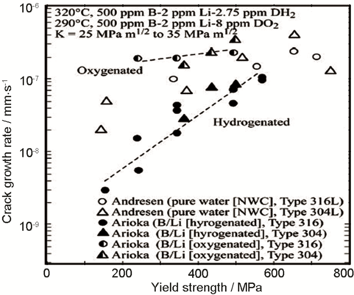 图1反映了屈服强度对不锈钢SCC扩展速率的影响。虽然水化学环境不同,但总体来说随着屈服强度的增大,裂纹扩展均呈增速趋势,且在含氧冷却剂环境中裂纹扩展速率更大。