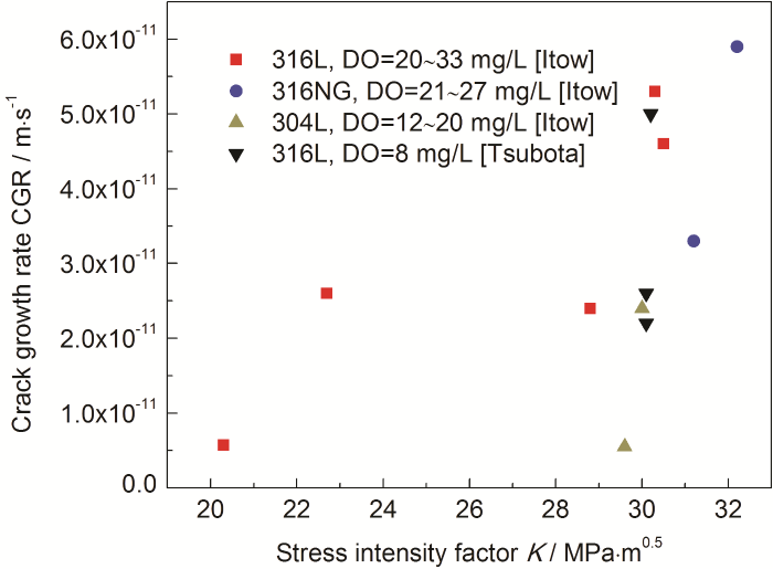 在中性环境中存在溶解氧 (DO) 或其他氧化剂是引起SCC的必要条件之一。一般溶解氧浓度越高,SCC越容易发生,要将腐蚀减至最小,溶解氧浓度必须维持足够低。杜东海研究了325 ℃ PWR一回路水中不同溶解氧浓度对316L不锈钢裂纹扩展速率的影响。当DO<200μg/L时,裂纹扩展速率随氧含量的增加急剧上升;DO>200μg/L后,CGR虽仍呈上升趋势,但变化缓慢;当DO>700μg/L,氧浓度的增加对裂纹扩展速率影响较小,趋于稳定。