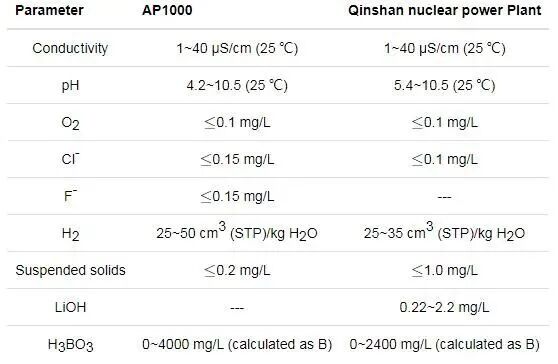 综上所述,不同水化学工况对机组运行和材料腐蚀都会产生较大影响,表1总结了AP1000和秦山核电站一回路冷却剂系统的水质要求作为参考。