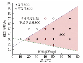 有些研究人员将氯化物的DRH视作不锈钢发生CISCC所需的相对湿度下限,然而这一判断准则可能不准确。许多研究人员在低于DRHRH下观察到了明显的腐蚀现象。SCHINDELHOLZ等在不同 RH 的氯化镁和合成海盐环境中进行试验,结果表明在RH11%氯化镁及RH23%合成海盐环境中,不锈钢都发生了腐蚀。因此,从保守角度考虑不锈钢贮存筒发生CISCCRH下限应低于氯化物的DRH