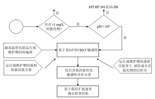 PARROT等给出了不同环境中CISCC敏感性评估的流程,见图3,并根据不同温度范围、氯含量和介质状态,将CISCC敏感性分为低、中、高三个等级,见表3;然后按照表面状态、冷加工、是否存在点蚀或缝隙腐蚀、是否存在循环载荷、是否持续添加适当缓蚀剂等因素对敏感性分级进行优化;根据敏感性分级得到对应的裂纹扩展速率,再依据裂纹扩展速率确定相应的检查时机。上述分级策略给出了依据温度、氯含量、应力等关键因素初步掌握不锈钢CISCC敏感性的思路,并明确了不同敏感性下对应的具体裂纹扩展速率,有利于对壁厚减薄等参数进行初步评估从而对不锈钢部件的检查时机进行确定。但是,该方法针对的是含氯液相环境,不是专门针对乏燃料干式贮存筒CISCC开发的敏感性评估方法,没有完全考虑氯化物沉积、潮解及衰变热等过程的影响。因此,无法直接将该方法用于乏燃料干式贮存筒CISCC的敏感性分级评价。