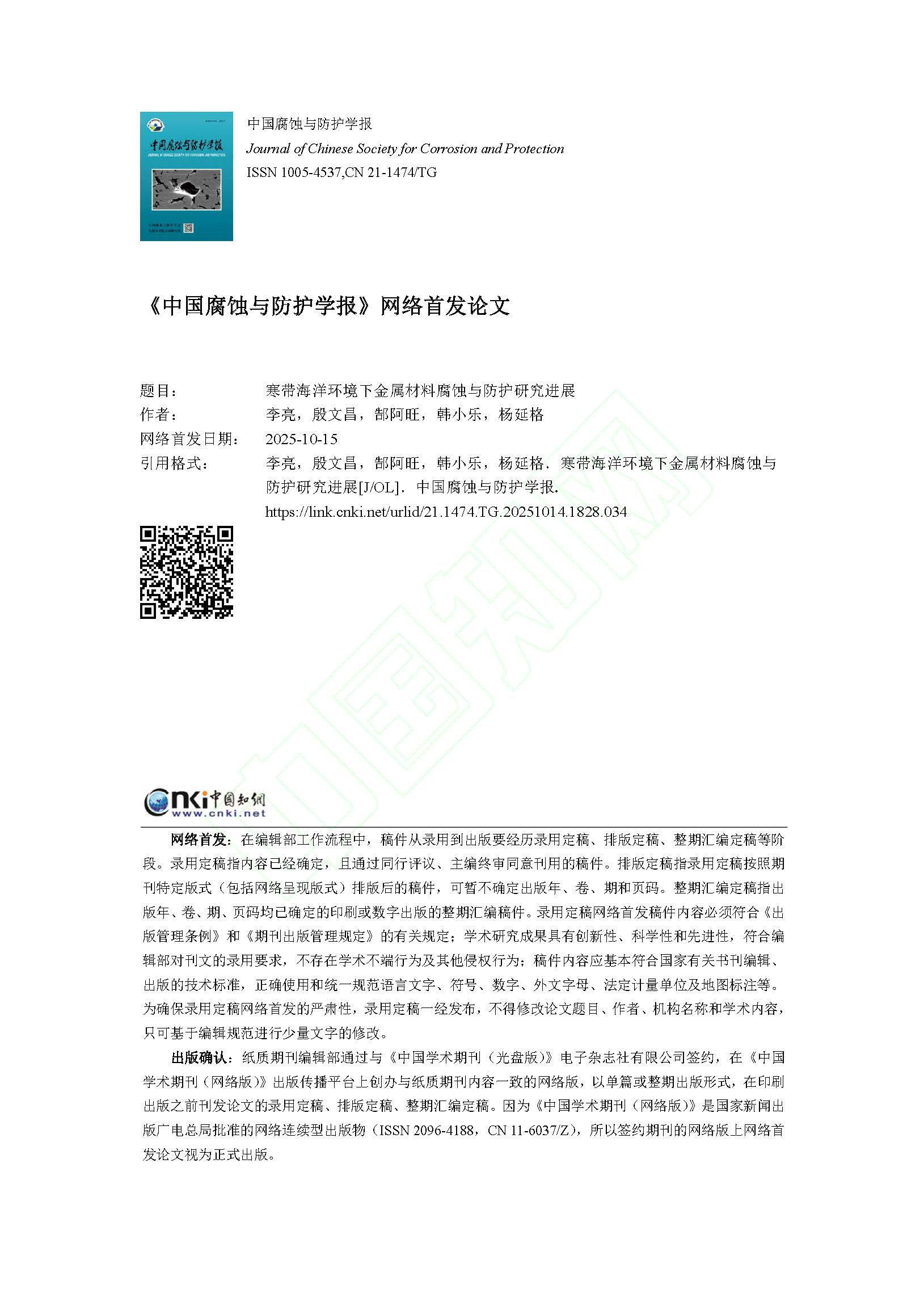 寒带海洋环境下金属材料腐蚀与防护研究进展