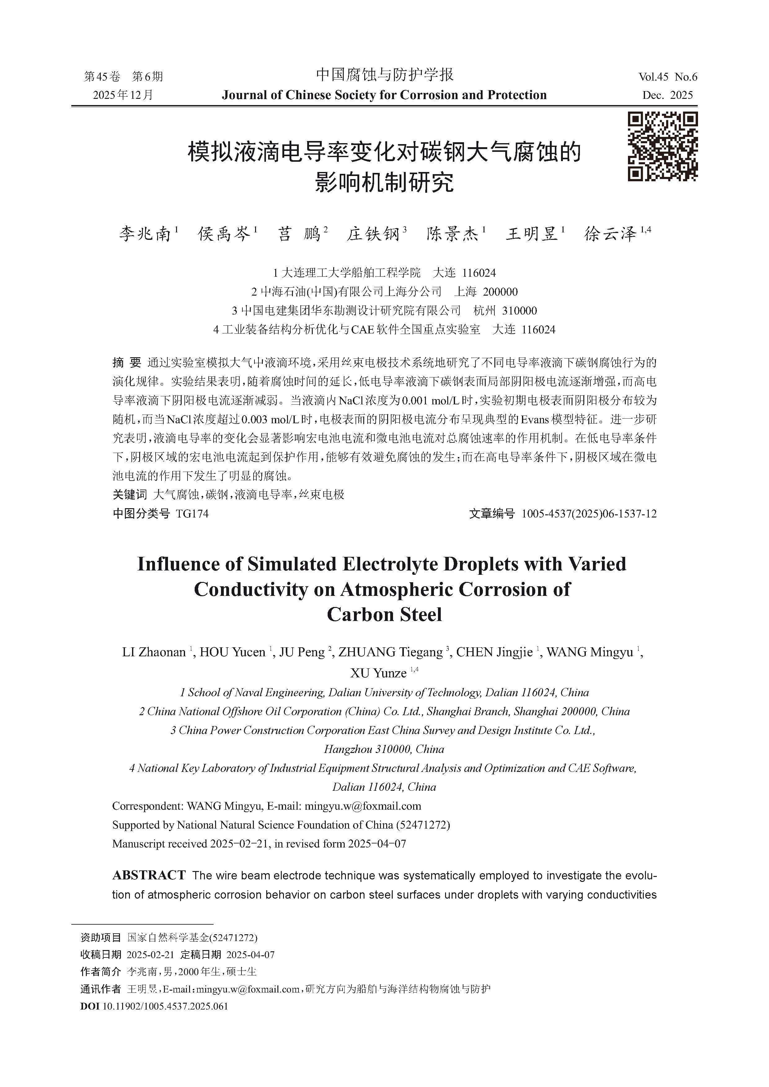 2025-11-10 16:01:14 作者:李兆南,侯禹岑,莒鹏,庄铁钢,陈景杰,王明昱,徐云泽 来源:中国腐蚀与防护学报 分享至:
