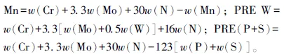 常见的双相不锈钢点蚀当量计算公式为PRE N=w(Cr)+3.3w(Mo)+16w(N)