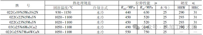 双相不锈钢最基本也是最重要的热处理是固溶处理,下表列出了典型铁素体-奥氏体双相不锈钢的热处理工艺和力学性能。不同类型的双相不锈钢,其固溶处理的加热和冷却基本理论是相同的,只是因合金元素的种类和含量的不同,在加热温度上略有差别。
