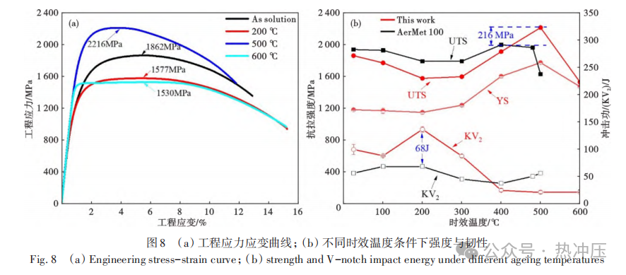818钢采用真空感应→真空自耗→锻造(锻比≥12)→热处理工艺流程,以3N级高纯铁为原料。其名义成分(质量分数)%为0.32C-2.0Si-1.1Mn-0.6Cr-2.2Ni-0.3Mo-0.4V,杂质元素严格控制:S、P、O、N、H总量82×10-6,As、Sn、Sb、Bi、Pb总量130×10-6。 团队开发的“深冷处理+二次淬火”工艺通过先消除后重新生成残余奥氏体(RA)的策略,获得了细小弥散的RA组织,如图5所示,显著提升了其稳定性与分布均匀性。在RA含量相近条件下,该工艺使冲击功较传统处理提升15%,最终获得抗拉强度1 909 MPa、屈服强度1 432 MPa、伸长率12%、V型冲击功50.8 J的优异综合性能[49-50]。 819钢采用真空感应→真空自耗→锻造(锻比≥13.5)→热处理工艺流程,以3N5级高纯铁为原料。其名义成分(质量分数)%为0.35C-1.62Si-0.86Mn-1.62Cr-3Ni-0.45Mo-0.22V,杂质元素严格控制:S、P、O、N、H总量45×10-6,As、Sn、Sb、Bi、Pb总量23×10-6,较818钢降低。 经980℃淬火+280℃回火后,819钢形成由板条马氏体、残余奥氏体与ε-碳化物组成的复合组织,如图6所示。其优异的强韧性源于协同作用机制:高位错密度板条马氏体与弥散ε-碳化物提供强化效应,板条亚结构与薄膜状残余奥氏体提供韧化贡献。最终获得抗拉强度2 013 MPa、均匀伸长率11%、夏比U型冲击功67.2 J的综合性能[51]。 821钢采用真空感应→真空自耗→锻造(锻比≥12)→热处理工艺流程,以3N级高纯铁为原料。其名义成分(质量分数)%为0.31C-2Si-1Mn-1Cr-5Ni-0.6Mo-0.1V-1.3Al,杂质元素S、P、O、N、H总量89×10-6。 经970℃淬火+180℃低温回火后,821钢组织由板条马氏体、残余奥氏体、ε-碳化物及高数密度纳米级NiAl团簇构成,如图7所示。均匀分布的NiAl纳米团簇可优化位错分布、减轻界面位错塞积,有效延缓微裂纹萌生,赋予材料卓越的强韧性:抗拉强度1 894 MPa、均匀伸长率接近15%、U型缺口冲击功83 J、断裂韧性高达108 MPa·m1/2[49]。 3.2高合金超高强钢 本研究通过在二次硬化钢中引入NiAl相(与Co协同),将M2C碳化物数量密度提升至1024 m-3。NiAl相与M2C碳化物相互抑制粗化的机制为开发高性能钢种奠定了基础。据此研制的2112钢(0.20C-12Co-13.5Ni-1Al-1.3Cr-1.3Mo-0.6 W)和A800钢(0.26C-13.5Co-14.2Ni-1.2Al-2.1Cr-1.8Mo-0.6 W)(质量分数)%均表现出优异性能。 2112钢采用真空感应→真空自耗→锻造开坯→轧制→热处理工艺流程,以3N级高纯铁为原料,其强韧性匹配如图8所示。 时效温度对2112钢的组织和性能具有显著影响。200℃时效时,马氏体基体中析出亚微米级ε-碳化物和高数密度纳米级NiAl团簇,两者独立形核;高数密度NiAl团簇通过缓解位错塞积,使冲击功达到136 J。500℃时效时,析出相演变为数密度达9.3×1023 m-3的NiAl相和3.3×1023 m-3的M2C碳化物(析出机制如图9所示),二者在高位错密度马氏体基体中均匀分布,协同贡献约600 MPa的屈服强度增量;此外,板条界面形成厚度约20 nm的薄膜状奥氏体,进一步提升了材料的塑韧性[8]。 A800钢采用真空感应→真空自耗→锻造开坯→轧制→热处理工艺流程,以4N级高纯铁为原料,拉伸性能如图10所示。 510℃时效后,马氏体基体中均匀析出高数密度纳米相:NiAl相14.5×1023 m-3、M 2 C碳化物2.2×1023 m-3,后者数密度是AerMet100钢的3倍[54]。在Co协同作用下[55],析出相尺寸控制在0.5~20 nm(图11),通过与位错的交互作用贡献超过1 000 MPa的屈服强度增量。 NiAl-M2C双析出体系呈现协同强化机制:NiAl相优先高密度析出并促进M2C形核[56],双析出提高了M2C数密度、细化了其尺寸并抑制相互粗化[57],显著提升了强度和热稳定性。此外,深冷时效调控形成的均匀薄膜状奥氏体改善了材料韧性[58]。 超高强度钢的未来发展将聚焦于实现更高水平的强韧性协同,核心目标是在维持超高强度的同时,显著提升断裂韧性及损伤容限性能,以满足新一代先进装备对材料安全性与可靠性的极限要求。其主要发展方向可概括为以下四个方面: 1)超纯净冶炼技术。通过采用高超纯铁为原料,采用多级真空熔炼技术,将钢中P、S、O、N等杂质元素及有害痕量元素的含量降至极低水平,从源头改善材料的韧性、疲劳抗力与环境耐久性。 2)高均匀性制备技术。深入开展凝固过程与塑性变形的基础理论研究,通过技术创新有效控制宏观偏析、缩松等凝固缺陷,并实现微观组织的均匀化调控,从而获得成分与结构高度一致的理想组织,为突破现有强韧化极限奠定基础。 3)人工智能驱动的材料设计。深度融合人工智能、机器学习与材料大数据,构建“成分-工艺-组织-性能”一体化智能设计平台。通过高通量计算与数据挖掘,逆向设计最优成分与热处理窗口,实现新材料的高效、精准开发,大幅缩短研发周期。 4)3 000 MPa级超级钢的极限探索。面向未来极端服役条件,挑战3 000 MPa强度级别的极限目标。亟须发展超越传统理念的新型强韧化理论(如多级异构结构设计、纳米尺度相变调控等),通过多尺度、多维度的协同优化,解决该强度级别下材料韧塑性急剧下降的瓶颈问题。