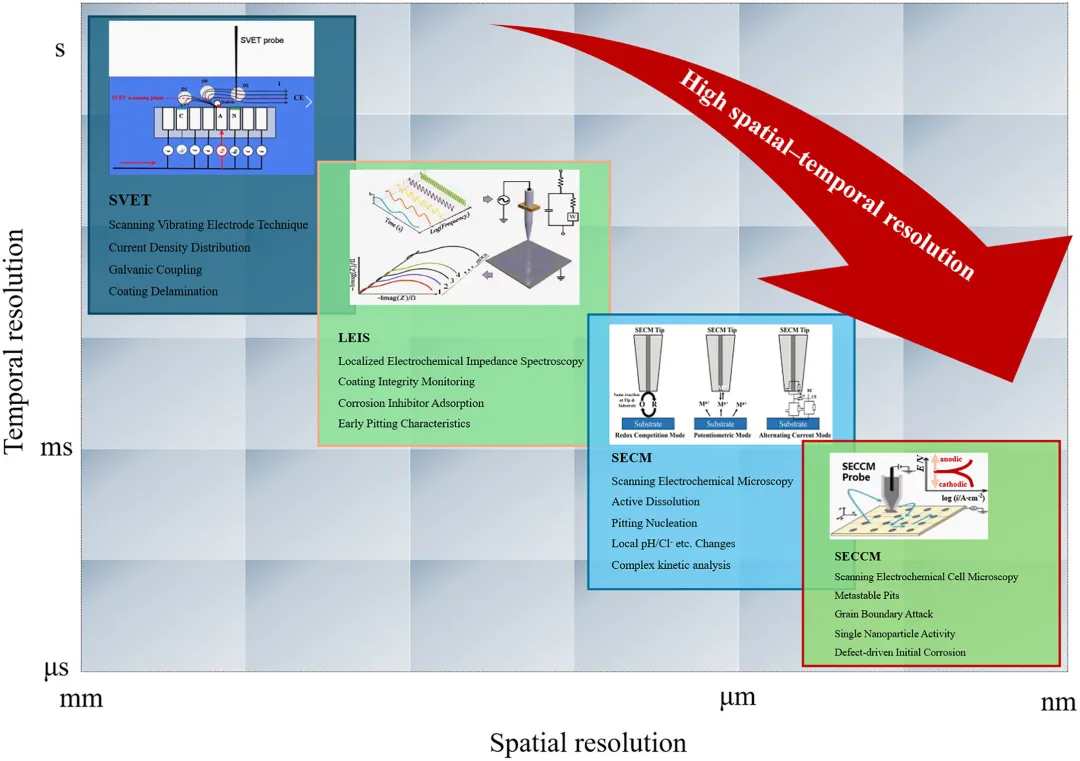 04 图文解析 图1直观呈现了本文所强调的研究范式转变:从以宏观电化学响应为中心的腐蚀评价框架,转向以本征反应动力学为核心的机理研究路径。传统腐蚀电化学更多依赖极化曲线和电化学阻抗谱等方法,通过空间与时间平均后的电流或阻抗参数来表征腐蚀行为,其解释逻辑本质上是“由结果反推过程”,难以区分不同反应和尺度效应的贡献,也不具有时空分辨。 相比之下,图1所示的新框架强调从界面反应出发,通过微区和原位电化学手段获取空间分辨的反应通量与动力学信息,并借助多尺度建模将这些信息还原为具有物理意义的本征参数。该图所要传达的并非某一种具体技术的优势,而是一种研究重心的转移:腐蚀电化学应从“表观测量的现象解释”走向“反应机制的定量重构”,从而为机理理解和预测能力奠定基础。 图2从空间与时间尺度两个维度,系统梳理了不同原位和微区电化学技术在腐蚀研究中的能力边界与互补关系。该图所强调的核心观点:不存在一种“万能”的电化学方法可以同时覆盖腐蚀过程的全部尺度,不同技术各自对应着不同的反应层级与信息类型,其价值只有在合理定位下才能被充分发挥。通过将SECM、SECCM、SVET、LEIS等方法置于统一的时空框架中,图2指出这些技术并非简单地“分辨率更高”,而是各自擅长捕捉不同类型的界面反应与传输过程。更重要的是,图中明确传达了一个方法论立场:微区和原位电化学数据本身并不等同于机理认知,只有在与定量动力学分析和建模手段相结合时,这些数据才能被转化为具有物理意义的本征反应参数。因此,图2所展示的并非技术清单,而是一张研究路线图。它提示研究者应根据具体腐蚀问题选择合适的时空观测窗口,并通过多技术协同与模型支撑,实现从局域信号到机理理解的跨越。这一观点进一步呼应了本文提出的反应导向研究范式,为未来腐蚀电化学研究提供了方法层面的指引。 以上共同构成了本文的核心思想图景:腐蚀电化学未来的发展方向,不在于单一技术分辨率的持续提升,而在于研究目标与解释框架的系统性转向。图1从研究范式层面指出,应当从以宏观表观参数为中心的腐蚀评价模式,转向以界面反应本征动力学为核心的机理研究路径;图2则从方法论层面进一步说明,不同微区与原位电化学技术在时空尺度和信息类型上各有边界,只有在合理分工与协同整合的前提下,才能服务于这一新的研究目标。两图结合强调的并非“多用新技术”,而是“如何使用这些技术”,共同传达的观点是:微区与原位电化学方法的真正价值,不在于提供更精细的图像或信号,而在于是否能够通过定量分析与建模,将多尺度观测结果转化为具有明确物理意义的本征反应参数。通过这一反应导向、尺度协同的研究框架,腐蚀电化学有望从经验表征走向机制解析与预测建模。