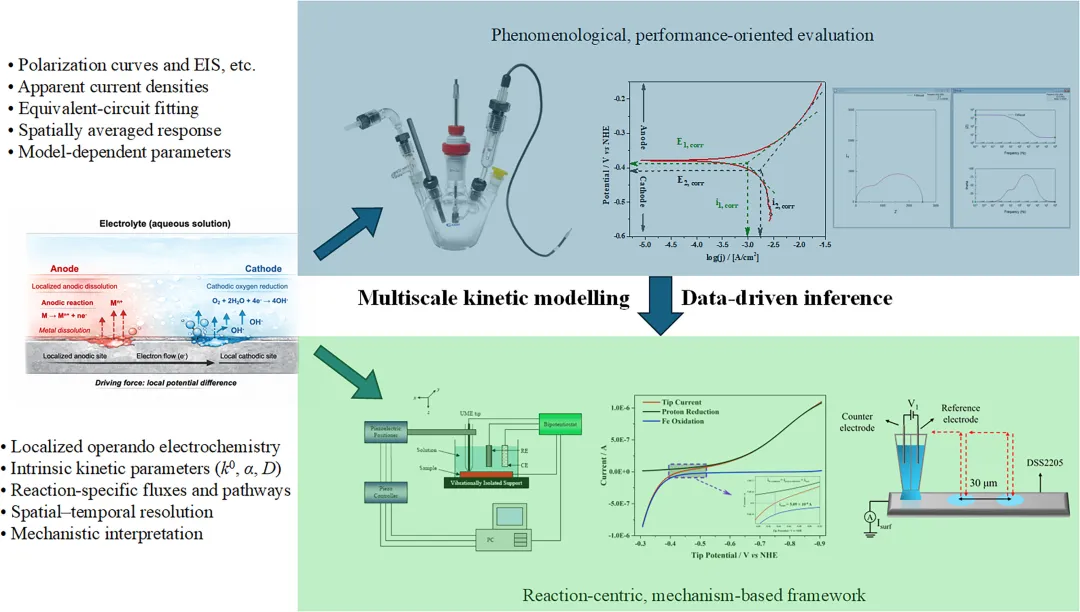 02 背景介绍 腐蚀本质上是发生在金属—环境界面上的电化学—化学耦合反应过程。长期以来,极化曲线和电化学阻抗谱等宏观电化学方法构成了腐蚀研究与工程评价的核心工具,在材料选型、服役评估和防护设计中发挥了重要作用。然而,这类方法获取的往往是空间与时间平均后的表观响应,其结果高度依赖模型假设,难以直接对应具体的反应路径与本征动力学参数。 随着材料体系与服役环境日益复杂,腐蚀过程呈现出显著的局域化、非稳态和多反应并行特征,传统以“表观腐蚀速率”为中心的分析框架逐渐暴露出机理解释能力不足的问题。近年来,微区与原位电化学技术的发展为直接观测界面反应提供了新的可能,但这些技术的潜力能否真正转化为机理认识,仍有赖于研究范式的系统性重构。在这一背景下,重新思考腐蚀电化学的研究目标与解释逻辑,具有明确的理论与方法学意义。