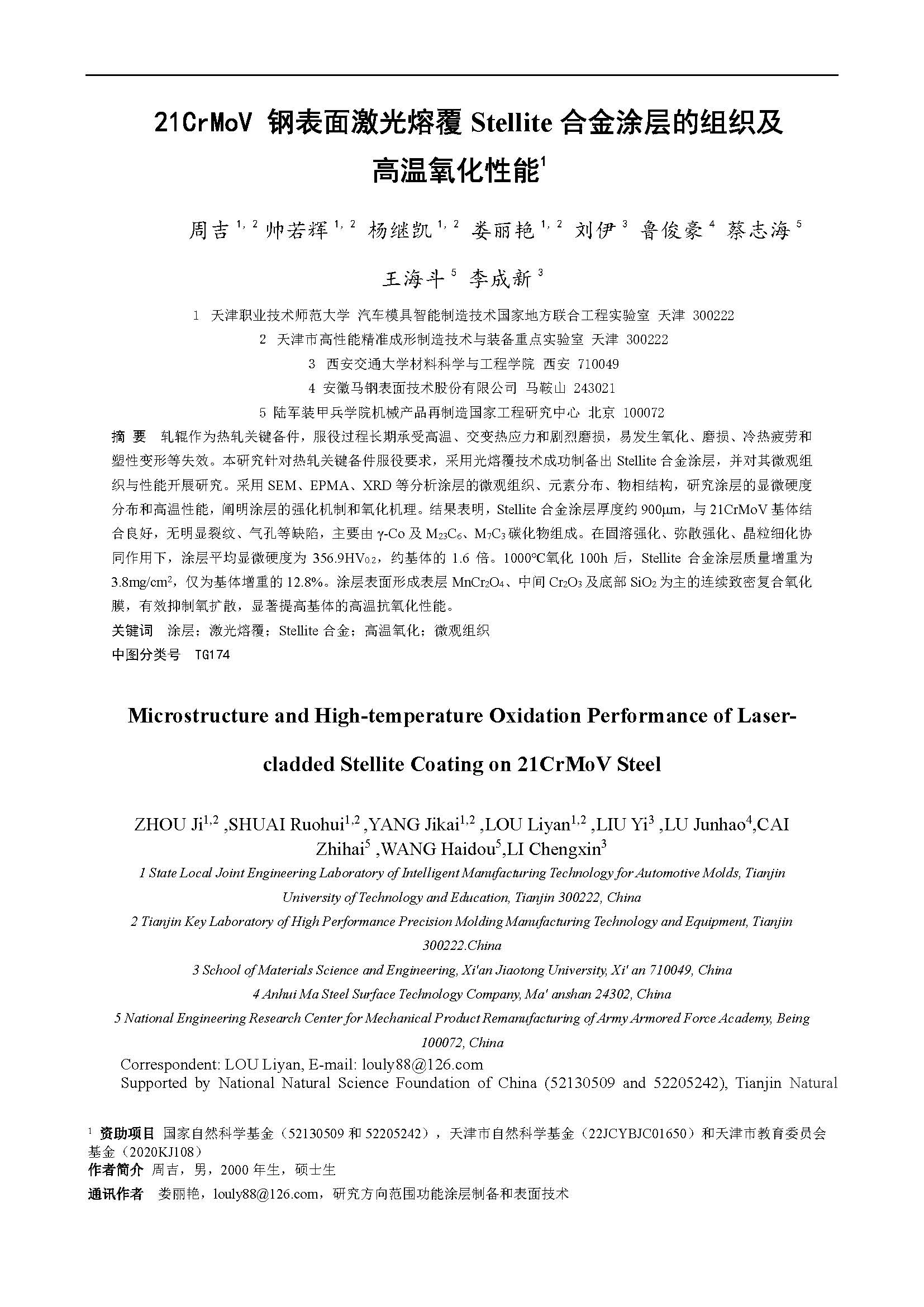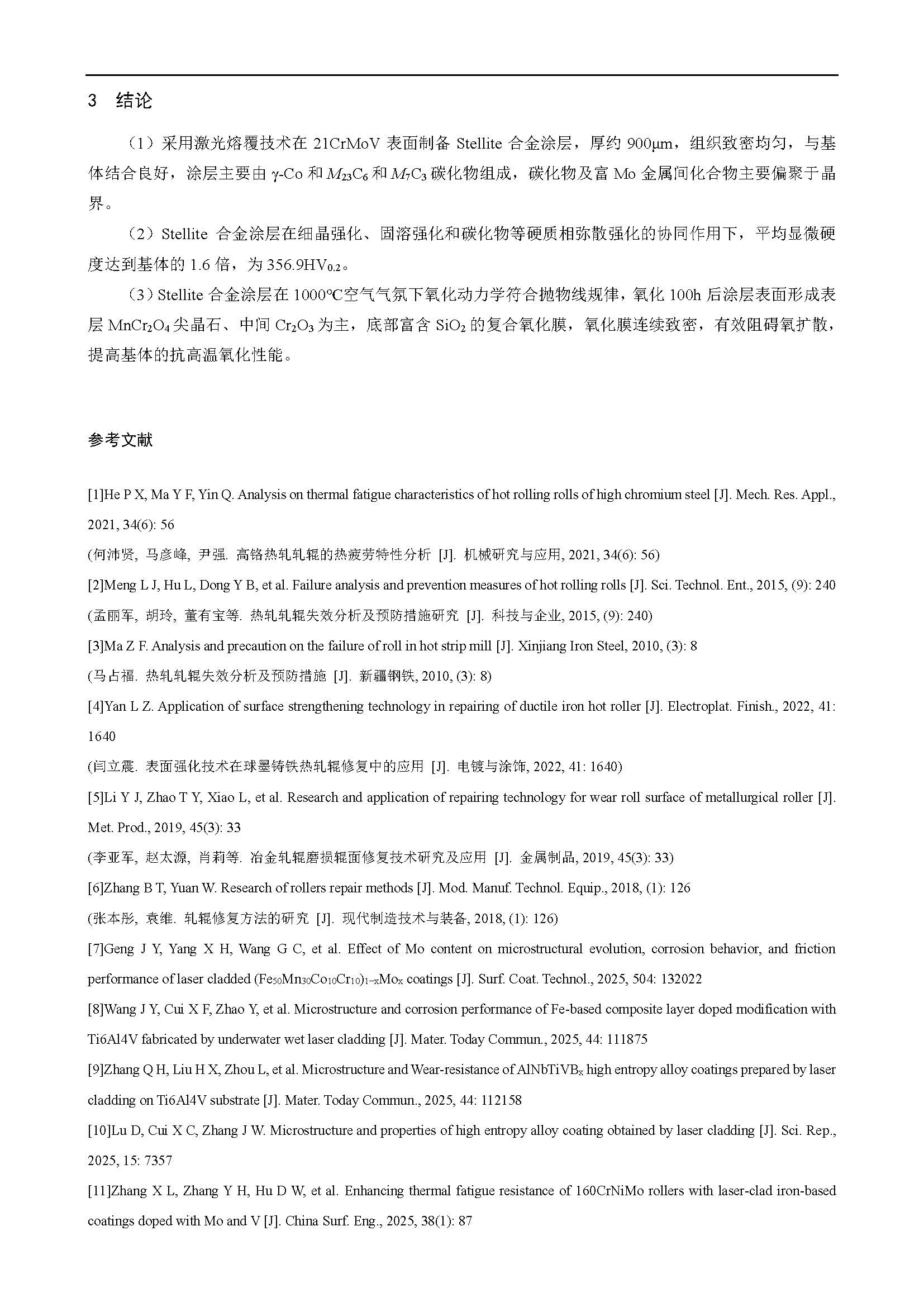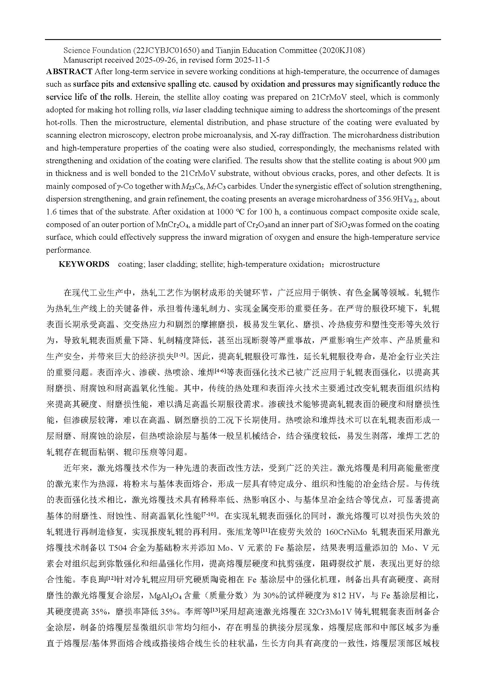 热轧关键备件表面激光熔覆Stellite合金涂层组织及高温氧化性能