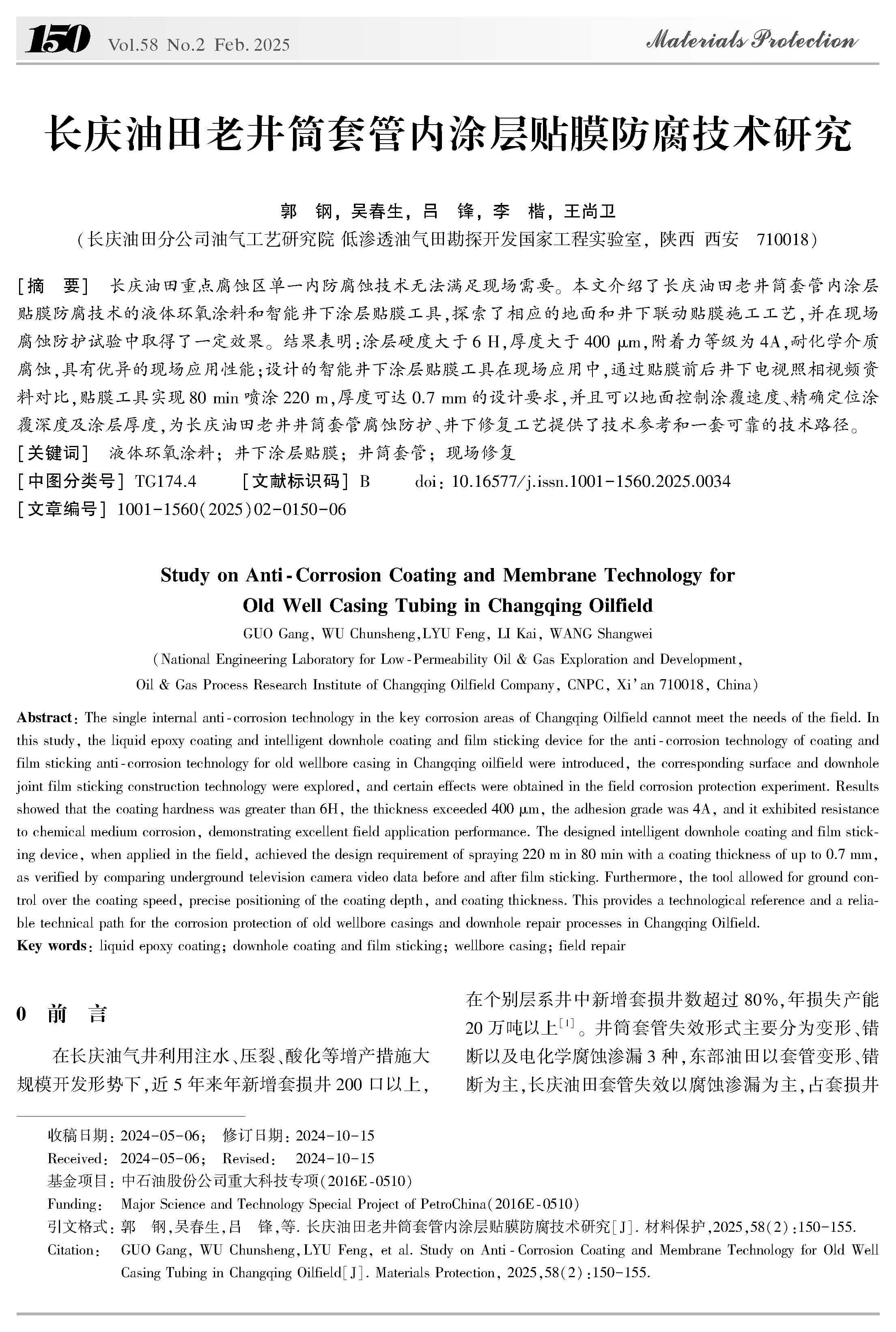 长庆油田老井筒套管内涂层贴膜防腐技术研究