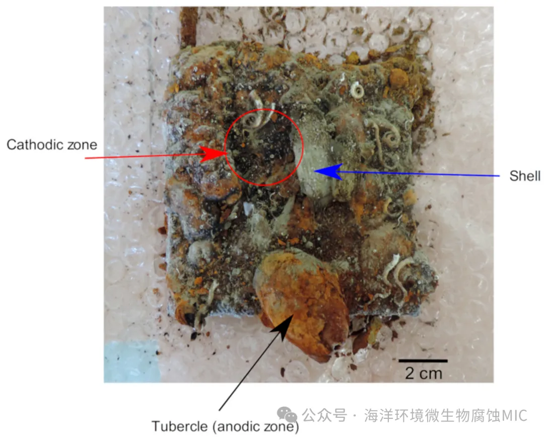 图3. 展示碳钢试样在自然海水中暴露6年后的表面形貌(暴露地点:海军集团实验室,瑟堡,英吉利海峡)。