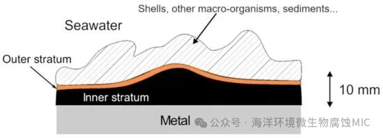 图 1. 经过6-11年永久浸没于自然海水中的碳钢试样的覆盖层示意图(横截面)。