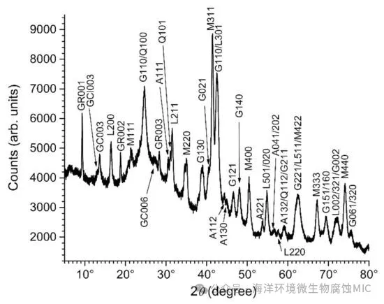 图 2. 对碳钢试样在自然海水中暴露 6 个月后的腐蚀产物层进行 XRD 分析(暴露地点:拉罗谢尔港的 Les Minimes 码头,大西洋)。A = 阿尔冈石,G = 黄铜矿,GR = 硫酸盐绿锈,GC = 碳酸盐绿锈,GCl = 氯化物绿锈,L = 蛭石,M = 磁铁矿,Q = 石英。衍射峰用相应的米勒指数表示。
