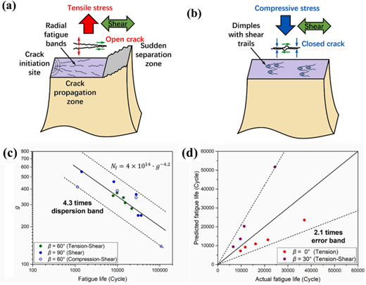 结果表明,拉伸和拉-剪应力状态下,从疲劳断口可以清楚看到裂纹萌生与扩展区域,但在纯剪和压-剪应力状态下却未呈现裂纹萌生与扩展特征(图2a和2b)。进一步分析发现,实际裂纹平面并不总是符合基于“临界平面法”的现有模型。特别地,本文选择实际的起裂平面作为“临界平面”,并通过引入一个依赖临界平面上剪应力范围和最大法向应力乘积的系数,提出了一种新的钛合金多轴疲劳寿命预测模型,该模型可以很好地关联拉伸、拉-剪、纯剪和压-剪等应力状态下钛合金的疲劳试验数据(图2c和2d)。