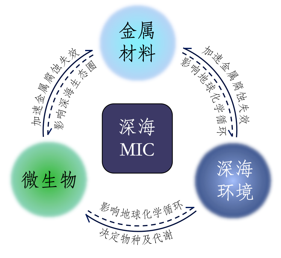 金属材料在海洋服役过程中普遍面临腐蚀风险,其中微生物腐蚀(microbiologically influenced corrosion,MIC)是导致材料失效的重要因素之一 [1]。MIC是指微生物通过其代谢活动及代谢产物影响金属表面的电化学过程,从而引发或加速腐蚀的现象[2]。MIC的研究可追溯至20世纪上半叶,von Wolzogen Kuhr和van der Vlugt于1934年提出了著名的“阴极去极化理论”,认为硫酸盐还原菌(sulfate-reducing bacteria, SRB)可通过消耗阴极产生的氢气而加速铁腐蚀[3]。同期,ZoBell系统研究了海洋细菌的附着行为及其与金属界面的相互作用,为理解海洋环境中的微生物-金属界面过程奠定了基础[4]。此后,Dexter[5]在海水体系中系统揭示了生物膜对阴极极化及腐蚀行为的影响,明确了生物膜与电化学过程之间的耦合关系;Hamilton[6]则从微生物生理与生化反应角度系统总结了SRB引发金属腐蚀的主要机制。这些工作共同构成了现代MIC理论的早期基础。 随着对微生物-金属界面过程认识的不断深化,研究者逐渐发现,传统“代谢产物驱动的化学腐蚀”理论难以充分解释多类MIC现象,大量研究表明胞外电子传递(extracellular electron transfer, EET)在多种腐蚀微生物中发挥关键作用。Lovley[7]和Nealson[8]团队基于地杆菌Geobacter与希瓦氏菌Shewanella的研究建立了EET的分子机制基础,揭示微生物可通过导电结构与多血红素体系实现固相电子传递。Widdel团队对嗜铁脱硫弧菌Desulfovibrio ferrophilus IS5的研究进一步指出,部分SRB亦能利用EET直接从金属铁表面获取电子[9-10],为电子传递型MIC的提出提供了重要的实验证据。基于这些进展,Little等在教材与综述中将MIC归纳为化学型(Chemical MIC, C-MIC)与电子型(Electrical, E-MIC)两类[11],对现代理论进行了体系化整理,使该分类框架在腐蚀科学与海洋工程领域得到广泛采用。 尽管现有MIC理论体系已较为成熟,但其认识主要基于浅海与近岸等常压环境。深海在压力、温度和营养结构上与浅海差异显著,相关研究多聚焦于微生物生态与代谢适应等生物学过程,然而,深海条件如何影响金属界面MIC的关键环节,如微生物活性、生物膜结构、代谢策略及界面电子传递等,仍缺乏系统认识[12]。这些极端条件可能重塑金属表面的电化学过程,使深海MIC呈现不同于浅海的腐蚀模式。 在海洋强国建设和深海装备制造业快速发展的背景下,深海微生物腐蚀防护技术已成为保障国家海洋权益、产业安全和装备可靠性的重要基础。因此,系统研究深海MIC的过程及其机制,不仅有助于揭示极端环境下的材料失效规律,也为深海工程材料优化、防护体系设计与服役可靠性评估提供科学依据,对推动我国深海技术发展具有重要战略意义。本文构建了深海 MIC 的概念框架(图 1),并从深海环境、微生物群落及金属材料界面过程三个维度,对相关研究进展进行了系统梳理。 图 1 深海MIC中环境、微生物与金属材料界面过程的耦合关系示意 近年来,研究人员从不同角度揭示了深海环境中微生物腐蚀现象的存在及其潜在机制。Zhai等[13]在西太平洋雅浦海沟约5772 m深处开展原位挂片实验,系统评估了钛合金、不同类型铝合金及铜合金等7类材料表面的微生物群落组成。结果发现,合金元素显著影响其附着微生物的结构与功能特征:钛合金表面富集多样性较高的互利共生型生物膜,无铜铝合金表面以硫单胞菌Sulfurimonas等寡营养适应菌为主,群落多样性最低,铜合金及含铜铝合金表面则富集了大量耐铜或可利用铜的菌属,如寡养单胞菌Stenotrophomonas、伯克霍尔德菌Burkholderia、卡巴列罗氏菌Caballeronia、副伯克霍尔德菌Paraburkholderia等。这些结果揭示了深海材料表面生物膜的显著差异性及其潜在腐蚀风险。 长期原位实验进一步表明,深海微生物能够显著加速金属腐蚀。新加坡团队在约1988 m的深海环境中对低碳钢链环进行了长达10年的原位暴露实验[14]。研究发现,链环表面出现了严重的局部腐蚀,其腐蚀坑深度和腐蚀速率(约200 µm·a⁻¹)均明显高于纯化学腐蚀预期。链环表面富集的微生物群落与周围沉积物显著不同,优势菌包括脱硫囊菌Desulfocapsa、脱硫弧菌Desulfovibrio和假脱硫弧菌Pseudodesulfovibrio等硫循环菌,其中Desulfocapsa可通过硫歧化代谢途径加速FeS等腐蚀产物的生成,而Desulfovibrio则利用金属表面产生的氢气作为电子供体进行硫酸盐还原。宏基因组和通量平衡分析进一步揭示了硫代谢在深海MIC中的关键作用。这项长期原位实验表明,深海环境中微生物与金属界面电化学过程的高度耦合,是材料加速腐蚀的关键驱动因素之一。 除了人工暴露实验外,深海沉船和人工结构物也为MIC研究提供了宝贵的原位观测对象。位于墨西哥湾1700~2000 m深处的二战沉船U-166等钢质残骸显示,在Deepwater Horizon石油泄漏事件发生后,其表面腐蚀速率显著增加,相关宏基因组与微生物生态分析表明,这一变化与沉船表面微生物群落的演替密切相关:外源碳源输入改变了原有群落结构,促进了铁氧化菌(如海深菌属铁氧化菌Mariprofundus ferrooxydans)和硫代谢菌(如Sulfurimonas)等腐蚀相关微生物的增殖[15]。进一步研究发现,沉船表面微生物群落与周围沉积物及水体存在显著差异,呈现明显的选择性富集效应[16]。宏基因组分析揭示这些群落富含与金属还原、硫循环以及电子传递等代谢功能相关的基因,可能通过电子传递、局部酸化及硫化物生成等途径,促进深海环境中金属的加速腐蚀。 除常规冷