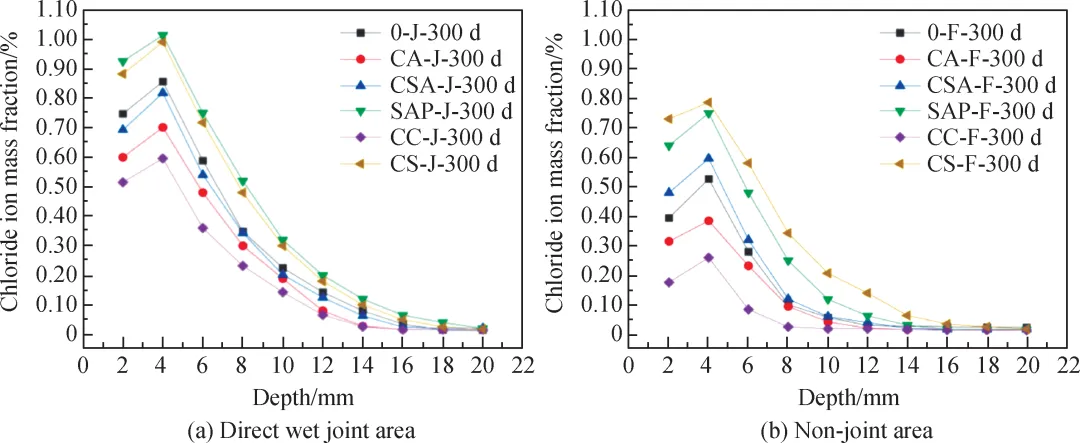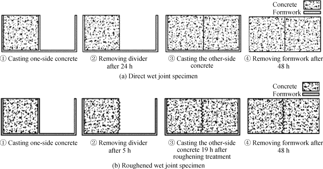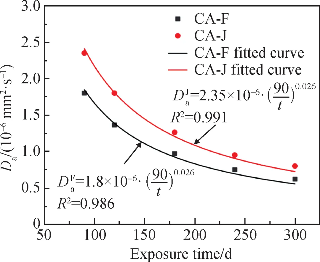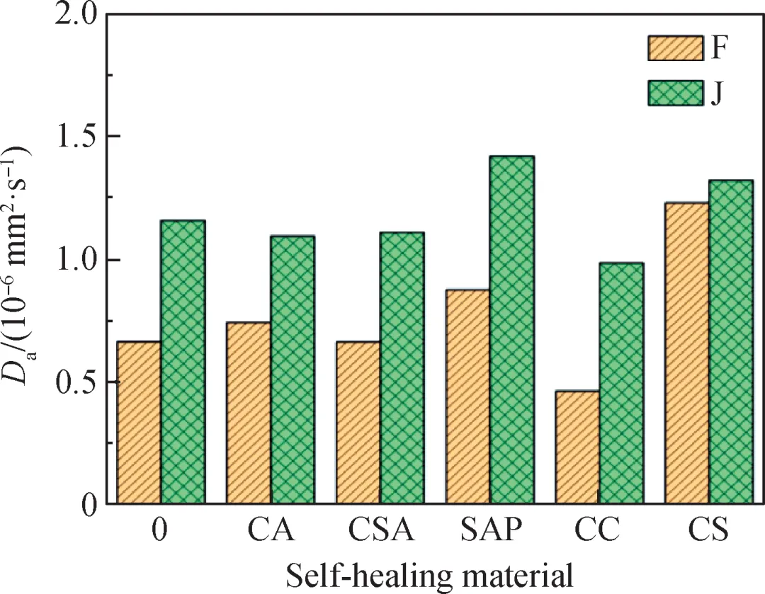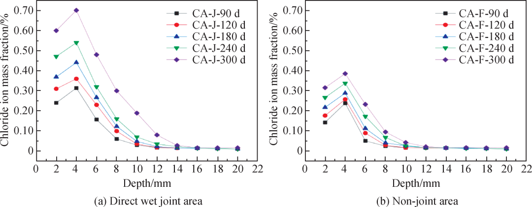 在滨海盐雾环境中,氯离子渗透是导致混凝土结构钢筋锈蚀、耐久性劣化的关键因素。装配式混凝土结构中普遍存在的施工接缝因界面区孔隙多、结构不连续,往往成为氯离子侵入的薄弱环节。目前,针对海水浸泡或干湿交替环境下接缝混凝土耐久性的研究较多,但对盐雾环境中带接缝混凝土的氯离子侵蚀行为及抑制措施尚缺乏系统研究。《硅酸盐通报》2026年第1期发表了来自江苏大学的研究论文《盐雾环境下带接缝混凝土抗氯离子侵蚀性能研究》(第一作者延永东),本文聚焦盐雾环境下带接缝混凝土的抗氯离子侵蚀性能,系统考察了接缝类型、侵蚀时间及自愈合材料类型对氯离子传输行为的影响。研究旨在揭示盐雾环境中接缝区氯离子的侵蚀规律,评估自愈合材料的防护效果,为提升沿海装配式混凝土结构的耐久性提供实验依据与理论支持。 原材料主要包括P·O 42.5水泥、天然河砂、碎石、一级粉煤灰,聚羧酸减水剂(SP)。此外,为得出不同类型自愈合材料对带接缝混凝土抗氯离子侵蚀的效果,在混凝土中掺加不同类型的自愈合材料:结晶外加剂(CA)、UEA膨胀剂(CSA)和高分子吸水树脂(SAP)。 考虑接缝类型、侵蚀时间、自愈合材料类型三种因素的影响,试件的强度等级设计为C60。其中接缝类型包括凿毛湿接缝(Z)和直接湿接缝(J)两种,同时设计非接缝(F)试件用于对比分析;自愈合材料包括单掺CA、单掺SAP、单掺CSA、复掺CA和SAP(记为CS)、复掺CA和CSA(记为CC)5种类型;侵蚀时间分别为90、120、180、240和300 d,其中接缝类型和侵蚀时间只针对单掺CA的试件。SP用量均为胶凝材料质量的0.3%,CA、CSA和SAP掺量分别为胶凝材料质量的2.0%、10%和0.5%。盐雾由质量分数为5%的NaCl溶液生成,盐雾箱内温度为(30±2) ℃,盐雾沉降率为0.125~0.025 mL/(h·cm2),采用间歇式喷雾方式,即喷雾12 h、间歇12 h,每24 h为一个循环,直至设定时间。 表1 自愈合材料的技术参数 表2 试件编号及配合比 图1 混凝土拌和流程 图2 带接缝混凝土试件制作流程 接缝类型对混凝土内氯离子质量分数的影响 相同深度处,三种接缝类型试件内氯离子质量分数由大到小依次为直接湿接缝试件、凿毛湿接缝试件、非接缝试件。在距表面4 mm深度处,三种接缝类型试件都出现了氯离子质量分数峰值,其中直接湿接缝混凝土内的氯离子质量分数相比凿毛湿接缝混凝土增大了51.1%,且直接湿接缝处的氯离子质量分数远大于非接缝处,而凿毛湿接缝处的氯离子质量分数与非接缝处相差较小,表明凿毛处理是改善混凝土接缝处耐久性的有效措施。 图3 不同接缝类型混凝土内的氯离子质量分数分布 侵蚀时间对混凝土内氯离子质量分数的影响 随着侵蚀时间的增加,接缝对混凝土抗氯离子侵蚀性能的劣化效果愈发明显。试件经盐雾侵蚀90、120、180、240和300 d后,直接湿接缝处的最大氯离子质量分数相比非接缝处分别增加了31.9%、40.1%、53.1%、60.2%和82.1%。随着侵蚀时间的延长,氯离子在混凝土内的影响深度逐渐增大。经过盐雾侵蚀90、120、180、240和300 d后,接缝处混凝土氯离子质量分数分别在距表面12、12、14、16和16 mm深度处趋于稳定,非接缝处混凝土氯离子质量分数分别在距表面10、10、12、14和14 mm深度处趋于稳定,相同侵蚀时间下接缝处的氯离子侵入深度要大于非接缝处。非接缝混凝土和带接缝混凝土均在距表面4 mm深度处出现氯离子质量分数峰值。 图4 不同侵蚀龄期下直接湿接缝与非接缝混凝土的氯离子质量分数分布 自愈合材料类型对混凝土内氯离子质量分数的影响 在同一深度时,非接缝处混凝土的氯离子质量分数由大到小依次为掺加CS试件、掺加SAP试件、掺加CSA试件、无掺加试件、掺加CA试件、掺加CC试件,接缝处混凝土的氯离子质量分数由大到小依次为掺加SAP试件、掺加CS试件、无掺加试件、掺加CSA试件、掺加CA试件、掺加CC试件。掺加CA和CC试件在接缝处和非接缝处的氯离子质量分数均低于对照组,且试件在距表面4 mm深度处出现了氯离子质量分数峰值。在非接缝处,掺加CA和CC试件的氯离子质量分数峰值相比对照组分别降低了18.1%和30.4%;在接缝处,掺加CA和CC试件的氯离子质量分数峰值相比对照组分别降低了26.9%和50.6%。说明单掺CA和复掺CA、CSA均可减弱接缝对混凝土抗氯离子侵蚀性能的不利影响。 图5 掺加不同自愈合材料的混凝土在接缝与非接缝处的氯离子质量分数分布 带接缝混凝土表观氯离子扩散系数分析 以掺加CA的混凝土试件为例,随着侵蚀时间的延长,混凝土在接缝处和非接缝处的表观氯离子扩散系数逐渐减小,且在相同时间段内,混凝土在接缝处的表观氯离子扩散系数均大于非接缝处。随着侵蚀时间的增加,相同间隔周期内的混凝土表观氯离子扩散系数差值不断减小。在侵蚀120~180 d、180~240 d和240~300 d三个周期内,混凝土在非接缝处的表观氯离子扩散系数分别降低了3.92×10-7、2.22×10-7和1.30×10-7 mm2/s。 以掺加不同类型自愈合材料的混凝土试件为例,混凝土在接缝处的表观氯离子扩散系数均大于非接缝处。掺加不同自愈合材料的混凝土接缝处的表观氯离子扩散系数由大到小依次为掺加SAP试件、掺加CS试件、无掺加试件、掺加CSA试件、掺加CA试件、掺加CC试件,非接缝处的表观氯离子扩散系数由大到小依次为掺加CS试件、掺加SAP试件、掺加CA试件、掺加CSA试件、无掺加试件、掺加CC试件。单掺CA与CSA的混凝土在接缝处和非接缝处