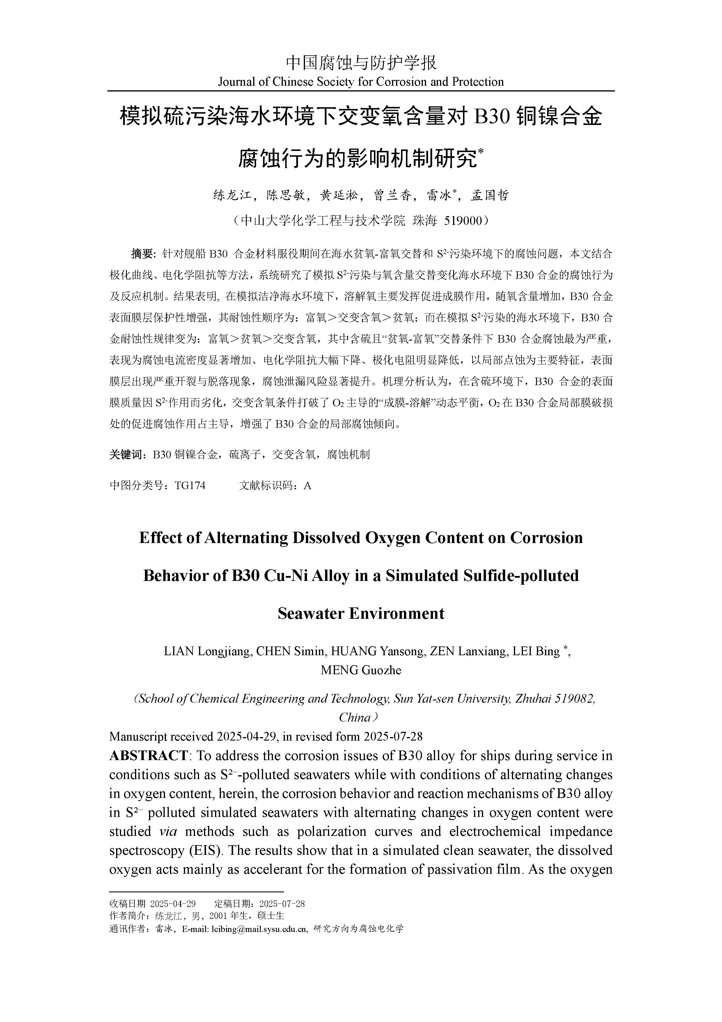 模拟硫污染海水环境下交变氧含量对B30铜镍合金腐蚀行为的影响机制研究