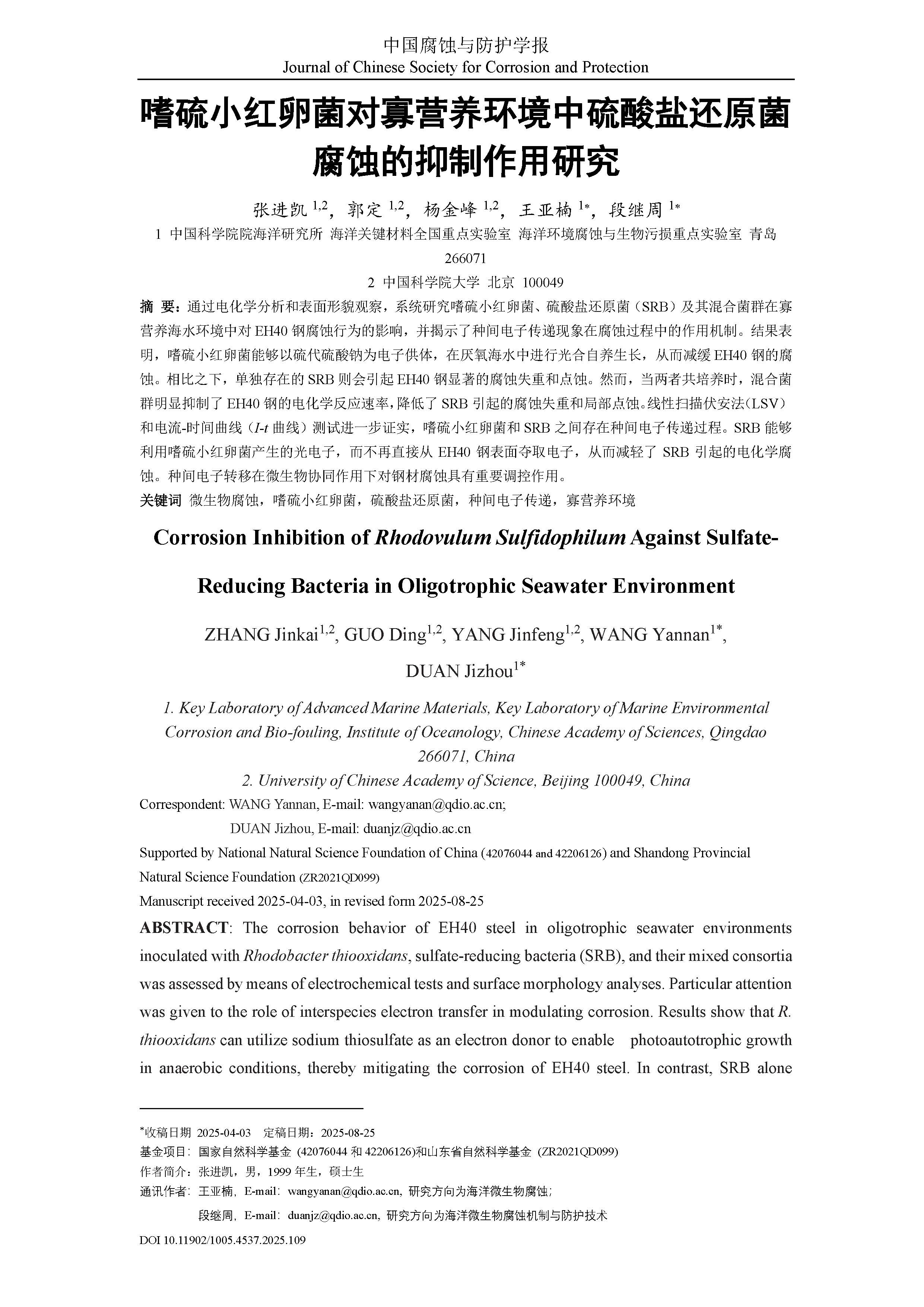 嗜硫小红卵菌对寡营养环境中硫酸盐还原菌腐蚀的抑制作用研究