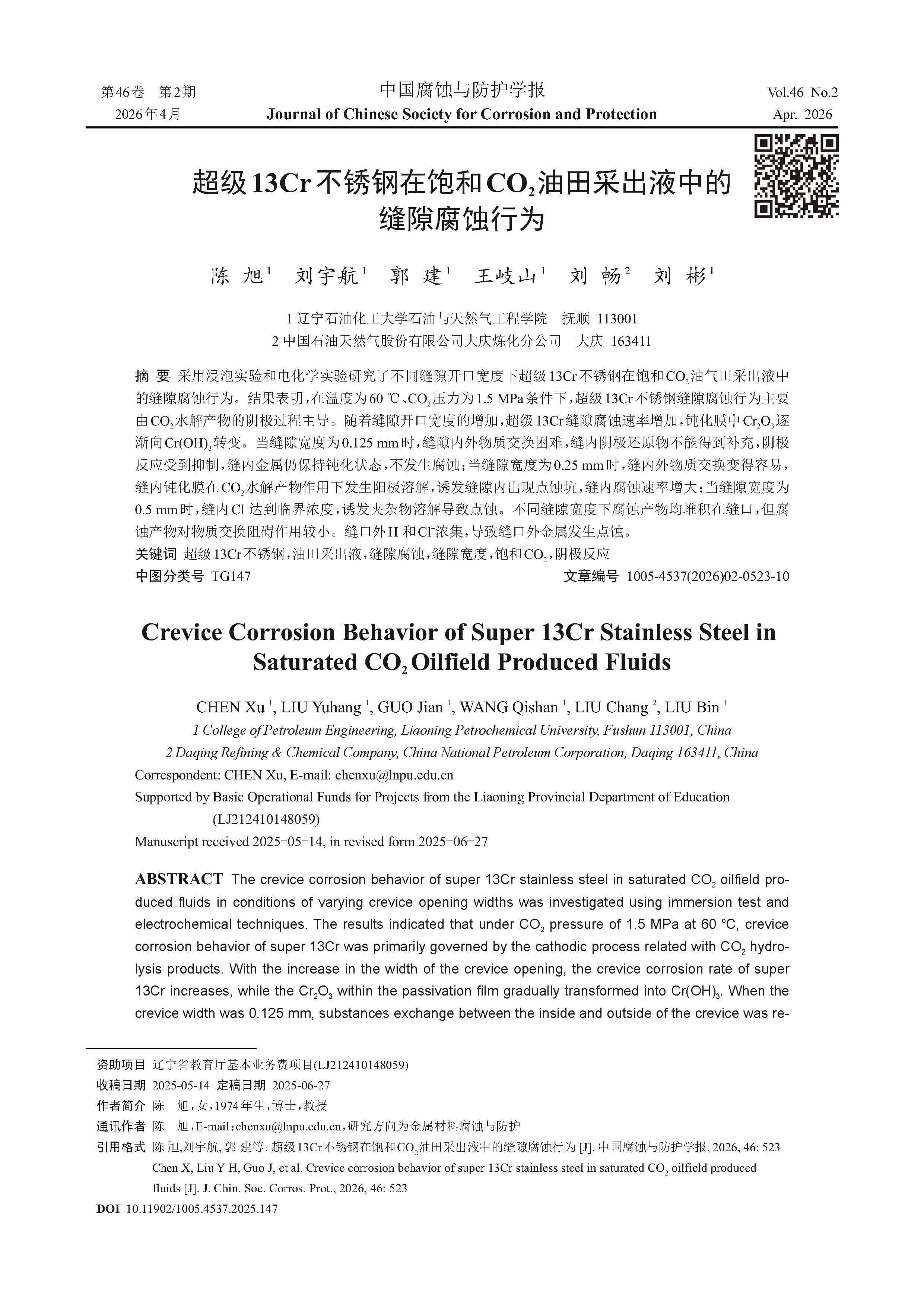 超级13Cr不锈钢在饱和CO2 油田采出液中的缝隙腐蚀行为
