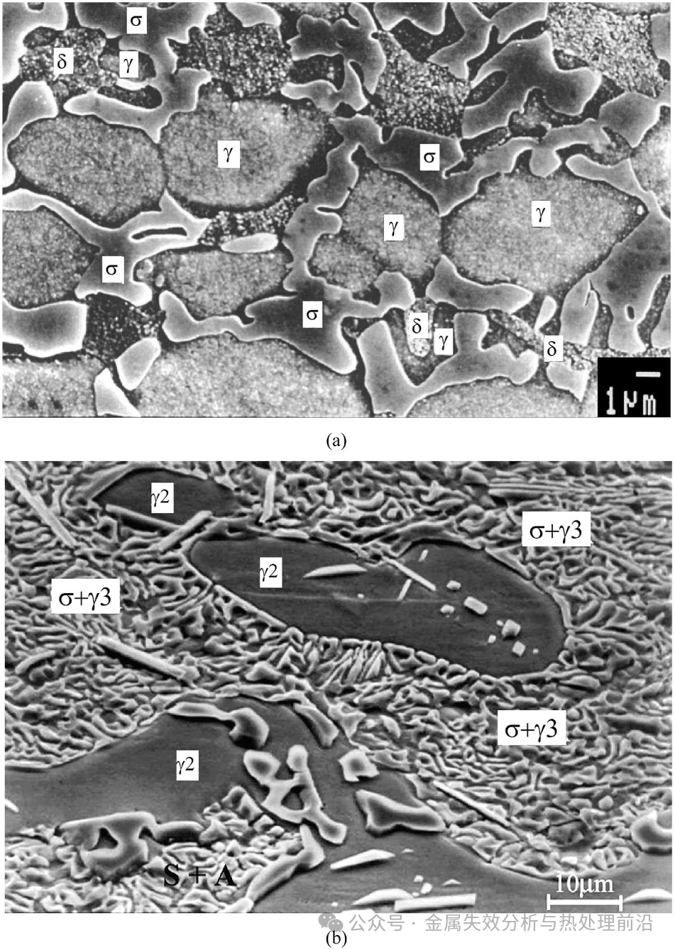 图10. 双相不锈钢(DSS)中的σ相析出:a)锻制S31803双相不锈钢,显示在850 °C下保温30小时后σ相的连续析出。扫描电子显微镜(SEM),二次电子像(SEI);b)高碳铸态W-Nr. 1.4464双相不锈钢,显示在850 °C下保温30小时后σ相+奥氏体共析组织的连续析出,其中A = 奥氏体相;F = 铁素体相;S = σ相,采用V2A-Beize腐蚀剂腐蚀。扫描电子显微镜(SEM),二次电子像(SEI)