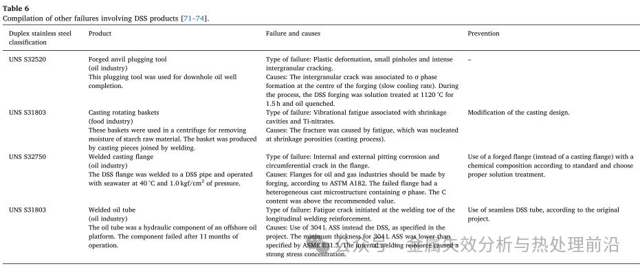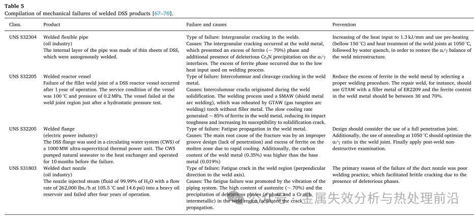 3至表6汇总了文献中报道的主要双相不锈钢(DSS)零部件失效分析案例。其中大多数失效发生于焊接接头区域,包括热影响区(HAZ)或熔合区。此外,近50%的失效涉及有害相(通常为σ相)析出。