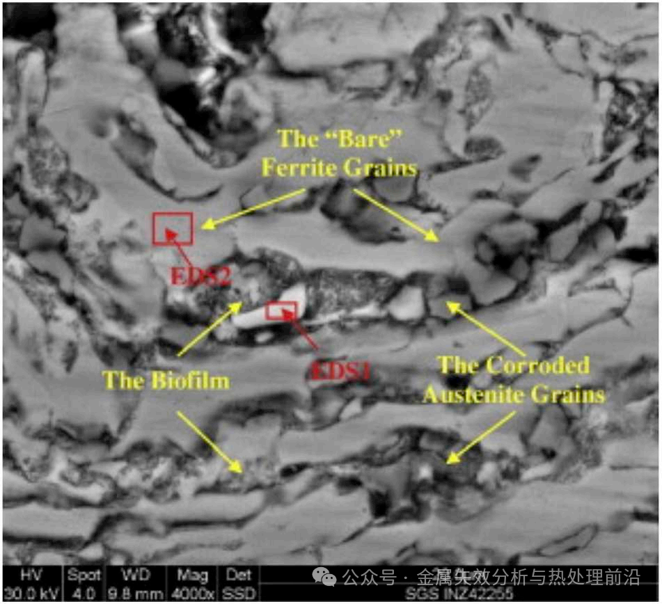 图17 热影响区(HAZ)微生物诱导腐蚀(MIC)的显微照片。细菌(见生物膜)优先附着于奥氏体晶粒并形成菌落中心,铁素体晶粒则构成骨架结构