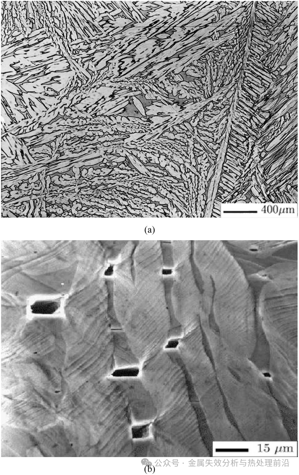 图20(a)熔合区的显微组织表征,显示魏氏体奥氏体及过量铁素体相。脆性疲劳裂纹主要为穿晶型,且无次级分叉;(b)熔合区的微观断口形貌,显示由此产生的脆性断裂。
