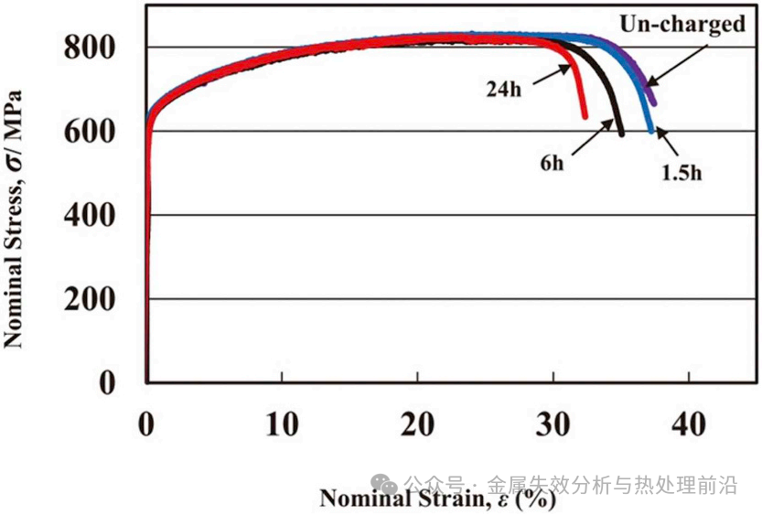 图16 氢脆现象。DSS SUS329J4L试样的应力-应变曲线对比:未充氢状态与以1.38×10⁶ s¹应变速率充氢后的状态