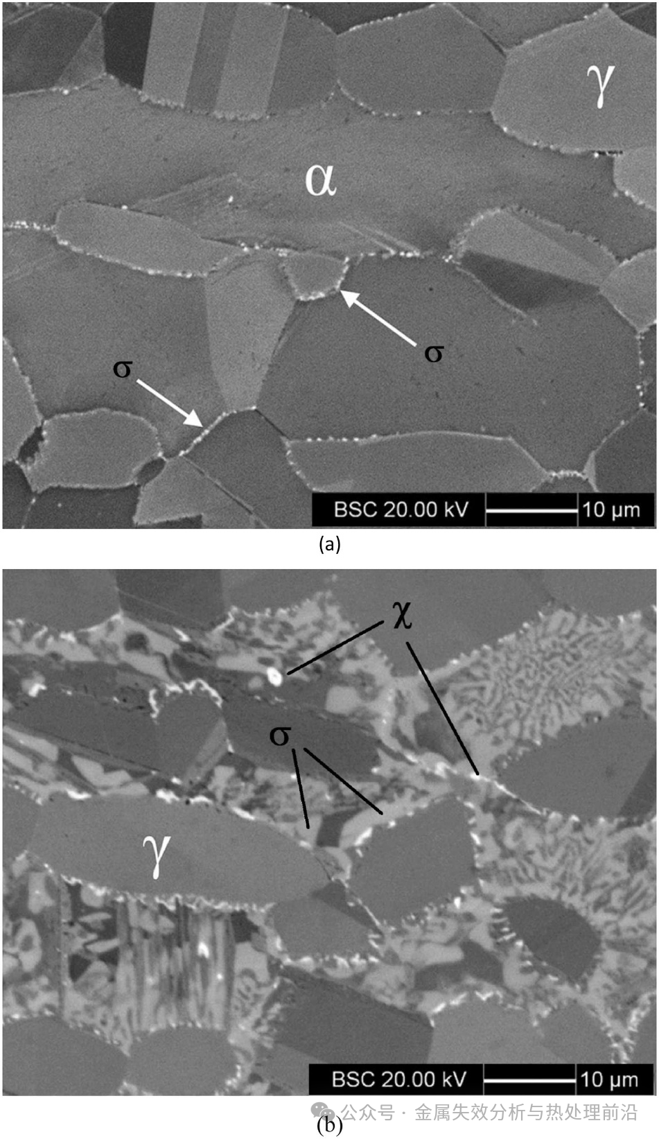图9. UNS S31803双相不锈钢在700 °C时效过程中σ相(灰色)与χ相(亮色)的析出:(a) 2小时;(b) 36小时。扫描电子显微镜(SEM),背散射电子像(BEI)