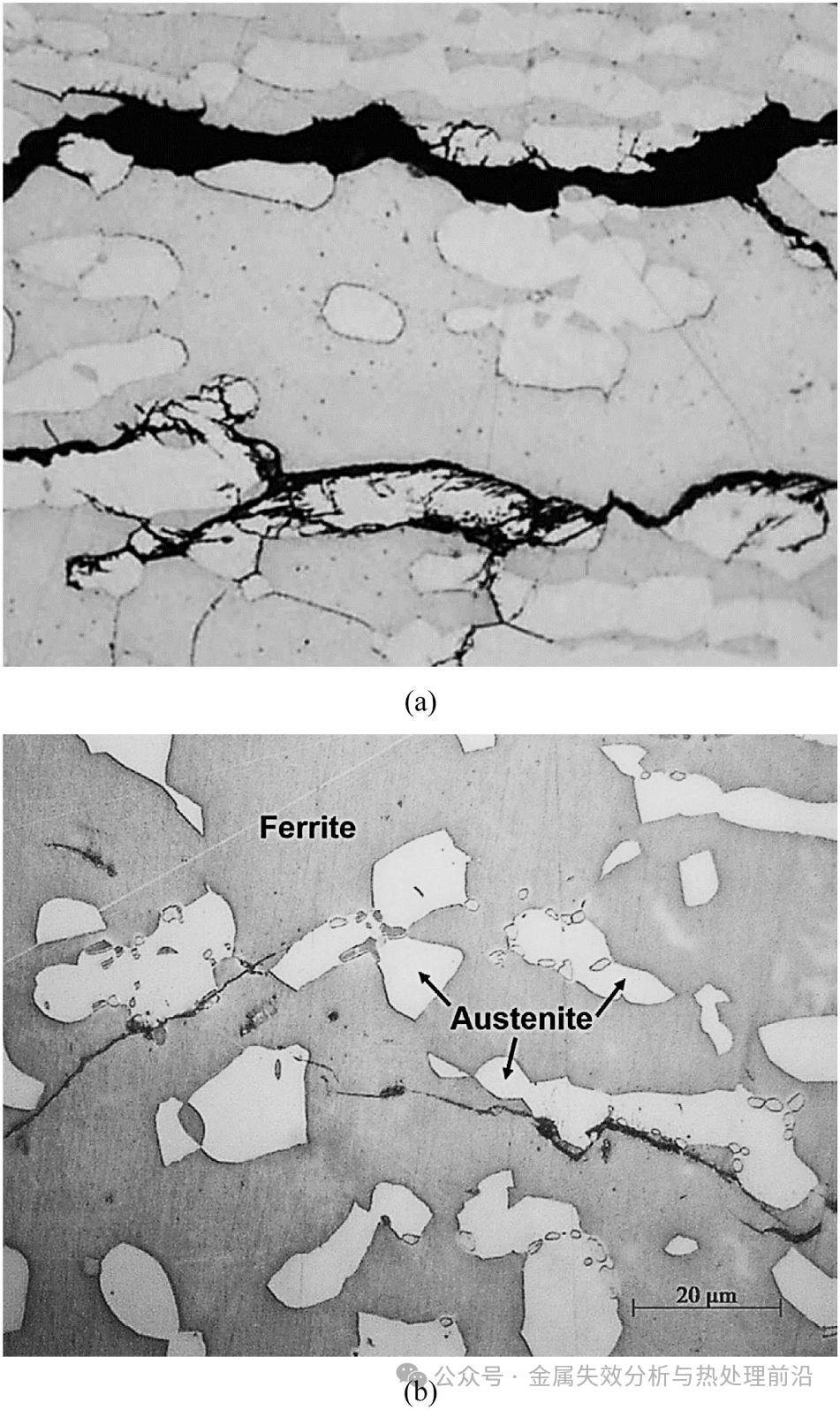 图18 环境辅助开裂。(a)焊接DSS容器的显微照片,显示热影响区(HAZ)中应力腐蚀开裂的扩展。该裂纹扩展由奥氏体/铁素体界面处σ相的析出所促进,并优先沿奥氏体/铁素体界面及铁素体晶界扩展,亦可在奥氏体相内扩展;(b)DSS锻件在退火热处理过程中,因奥氏体/铁素体界面处析出σ相而诱发的硫化物应力开裂。该裂纹优先在铁素体相内及沿奥氏体/铁素体界面扩展