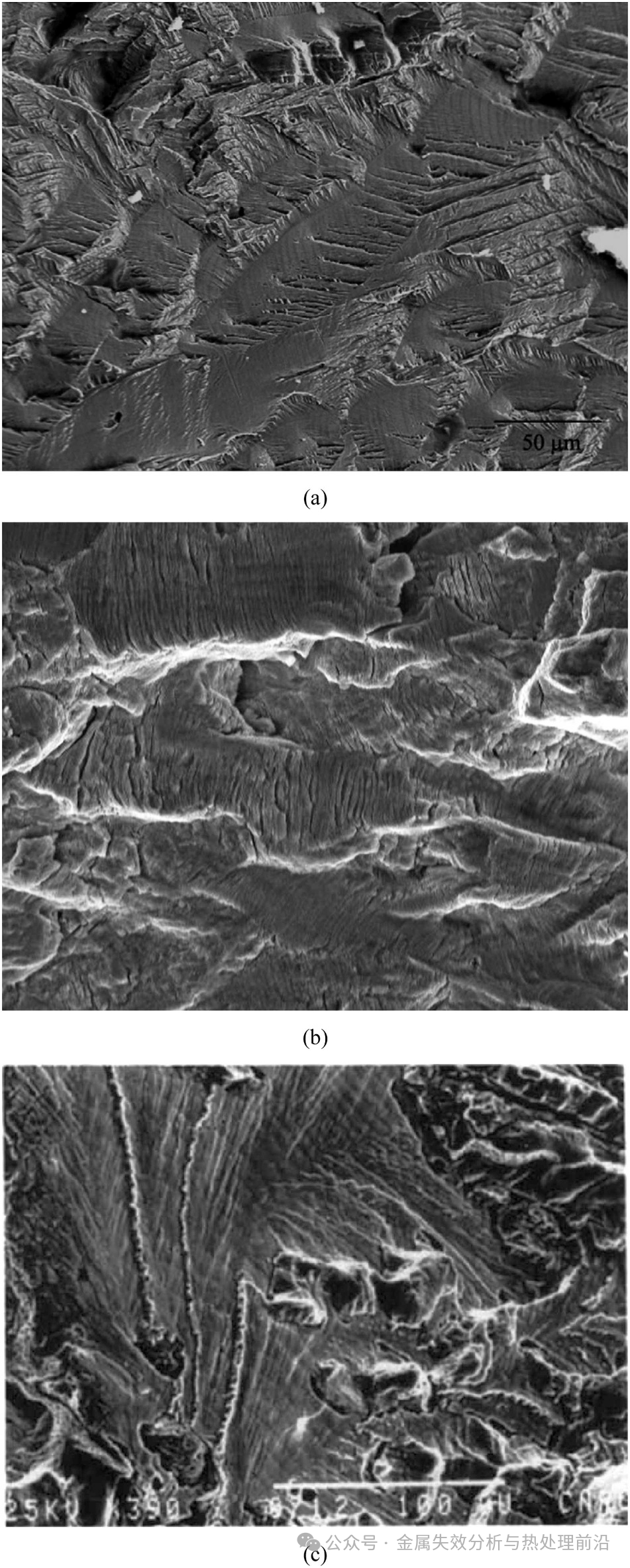 其他类型的DSS零部件失效见表6。例如,某一案例中,疲劳裂纹萌生于DSS铸件的缩松孔隙处,导致疲劳裂纹扩展形貌异常,主要呈现脆性特征(据作者所述,对应于铁素体晶粒);其余区域则被作者识别为疲劳条带(可能对应于奥氏体晶粒)(见图21a)。该断口形貌解释与DSS钢中典型的疲劳条带(见图21b)不符,提示可能存在腐蚀-疲劳作用(见图21c)