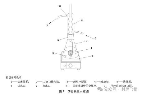 沸腾和高温条件下试验时,应使用带锥形磨口并配有足够冷却效果的玻璃立式回流冷凝器的烧瓶。试验装置示意图见图 1。