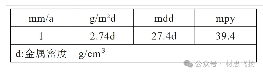 由于国内外及行业计量单位的不同,腐蚀速率单位各有不同,可按以下公式进行转换理解(来源:G. Wranglén, An Introduction to Corrosion and Protection of Metals, Chapman and Hall)