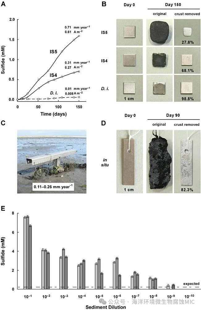 图一:纯培养和原位腐蚀性硫酸盐还原菌。A. 腐蚀菌株 IS5 和 IS4(分别提出:Desulfovibrio ferrophilus 和 Desulfopila corrodens)培养中长期硫化物形成(以硫酸盐消耗量衡量),铁片作为唯一的电子供体,以及氢营养对照培养(Desulfopila inferna, D. i.)。B. 相同培养中的厚腐蚀层和金属损失。去除腐蚀层后,残留金属(初始百分比)在用 HCl-六胺处理后变得明显。C. 沃登海,Sylt 岛(北海)中铁片的定位装置(不锈钢)。铁片用线绑在装置上,埋在缺氧沉积物中≥20 厘米深处三个月。D. 腐蚀层(含沙粒)和腐蚀金属(腐蚀层溶解后)来自(C)。此处拍摄的新鲜铁片(第 0 天)与培养的铁片不同。E. 六个月后,在原位沉积物(2 克,湿重)中进行系列稀释(平行三组)后形成的硫化物(以硫酸盐消耗量衡量)。 这条线表示仅通过铁和海水形成的氢气(H2)消耗所预期的硫化物(基于独立测量的氢气形成速率和仅使用氢气清除 SRB 的实验)。