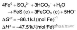 硫酸盐还原菌(SRB)可以通过一种与CMIC 根本不同的机制,更深入地参与厌氧铁腐蚀。这一观点最早在一项开创性的研究中被提出,该研究研究了缺氧土壤中的铁管腐蚀(von Wolzogen Kühr 和 van der Vlugt, 1934)。研究表明,SRB 将铁作为硫酸盐还原的唯一还原当量来源。这种纯粹化能自养过程的净化学计量,此处与常见的碳酸盐(菱铁矿)沉淀一起,是: