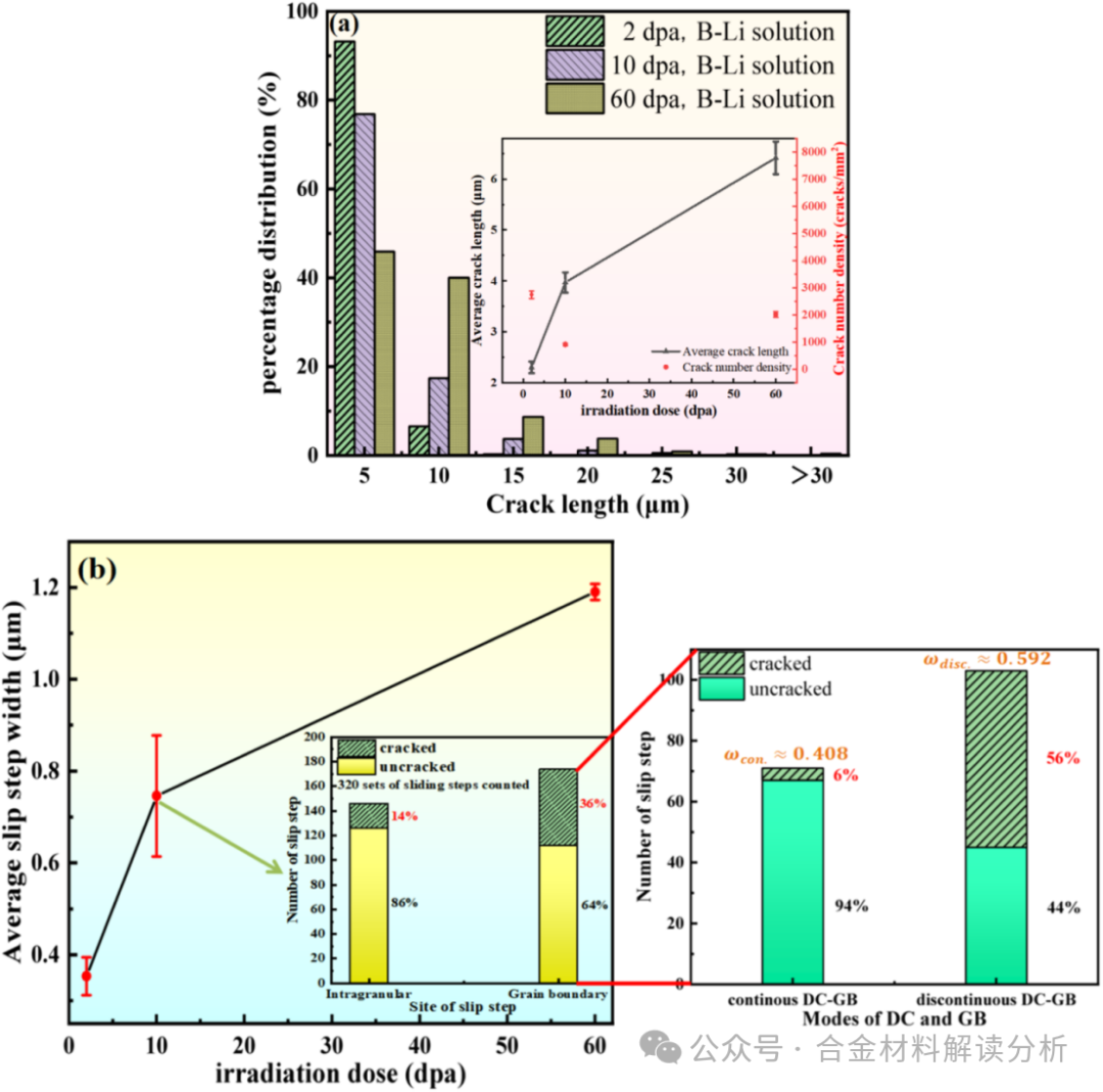 图7:慢应变速率拉伸试验后裂纹和滑移台阶统计图:(a)不同剂量裂纹长度分布及平均裂纹长度和裂纹数密度随剂量的变化,(b)滑移台阶平均宽度随辐照剂量的变化及10 dpa辐照样品滑移台阶和裂纹位置统计规律。