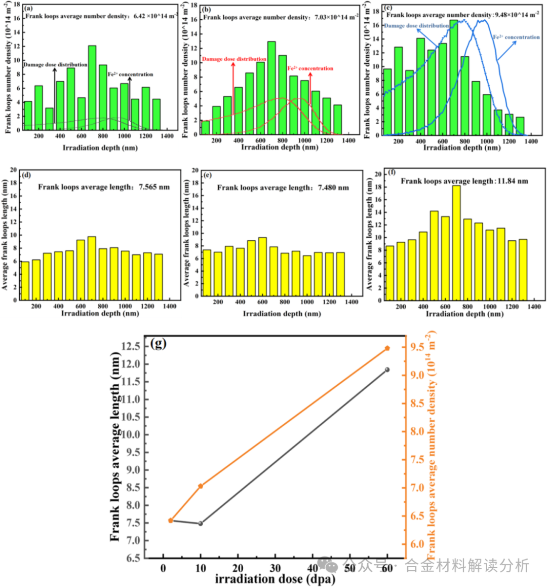 图4:位错环的局部和整体统计结果:(a-c)位错环数密度随深度的变化,(a)2 dpa,(b)10 dpa,(c)60 dpa;(d-f)位错环平均尺寸随深度的变化,(d)2 dpa,(e)10 dpa,(f)60 dpa;(g)位错环整体数密度和平均尺寸随剂量的变化。