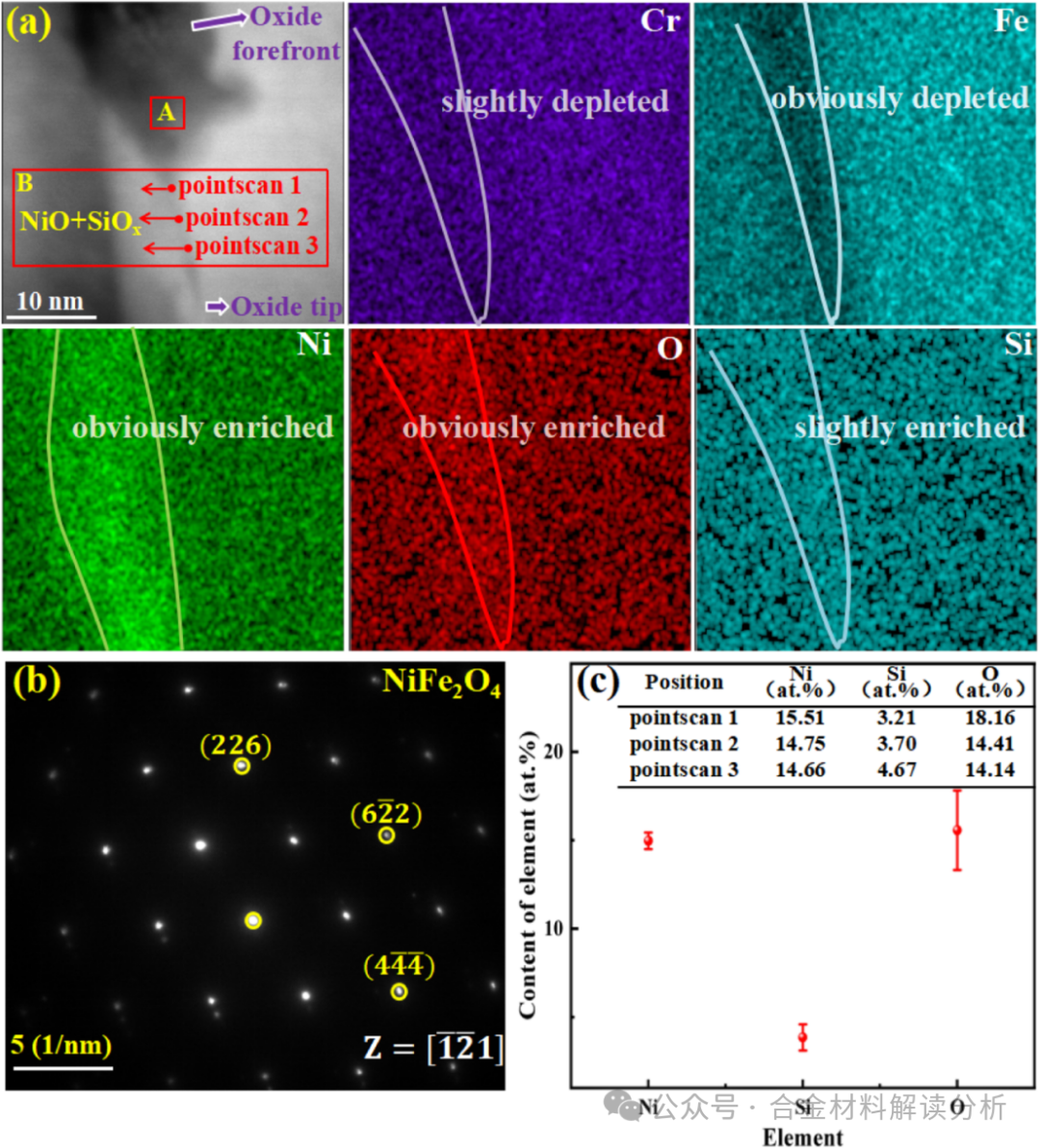 图10:60 dpa辐照样品峰值损伤区内裂纹氧化区的详细微观信息:(a)氧化区面扫描图像,(b)图a中A区,氧化前沿的SAED图谱(Z=[1-21])和相结构,(c)图a中B区,氧化尖端不同位置的点扫描结果。