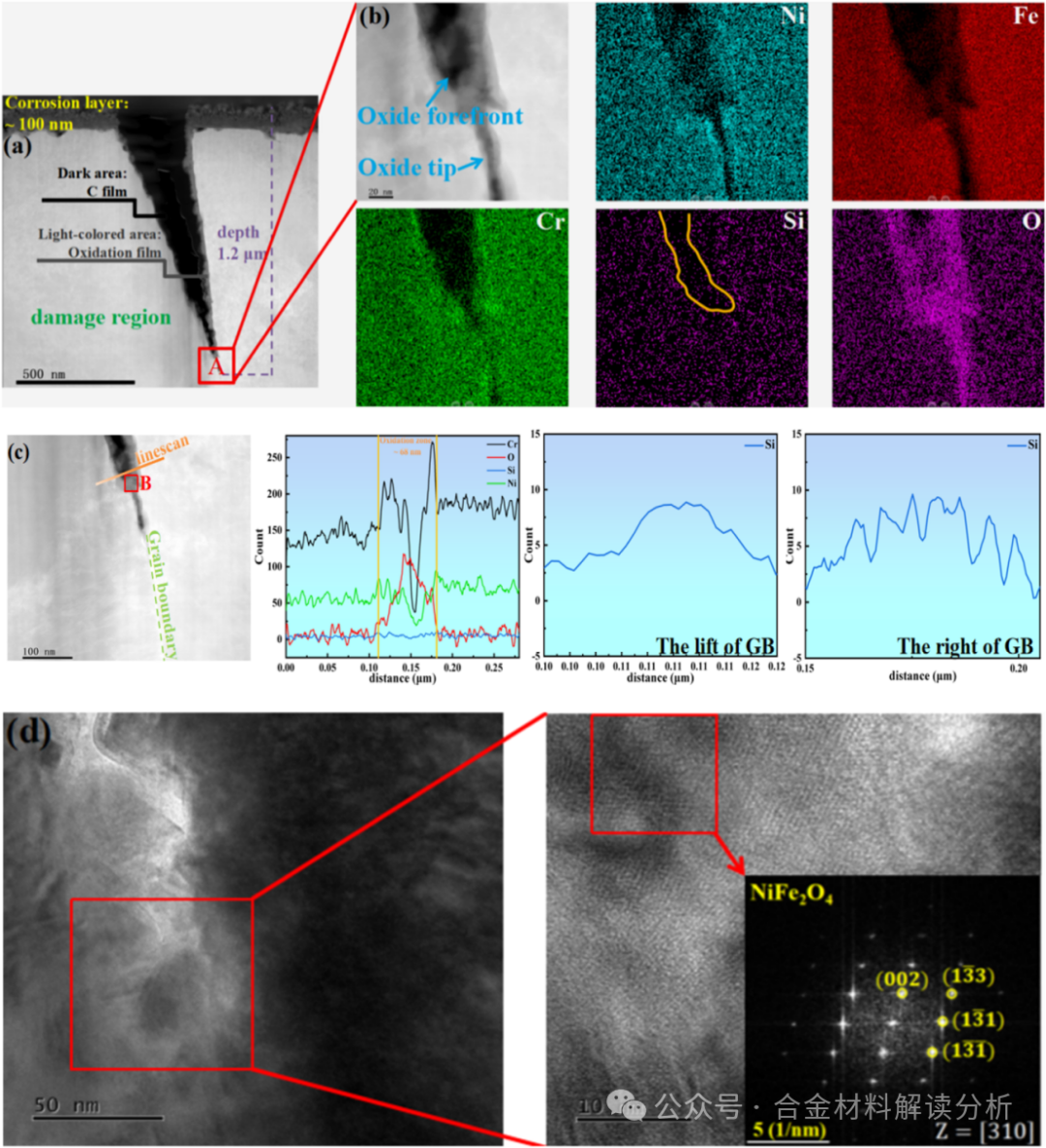 图11:辐照区裂纹尖端的截面形貌及微观信息:(a)辐照区裂纹截面形貌,(b)图a中A区,裂纹尖端前氧化区STEM/EDS面扫描元素分布,(c)STEM/EDS线扫描获得的氧化前沿元素分布,(d)图c中B区,HAADF分析获得的氧化前沿物理相结构。