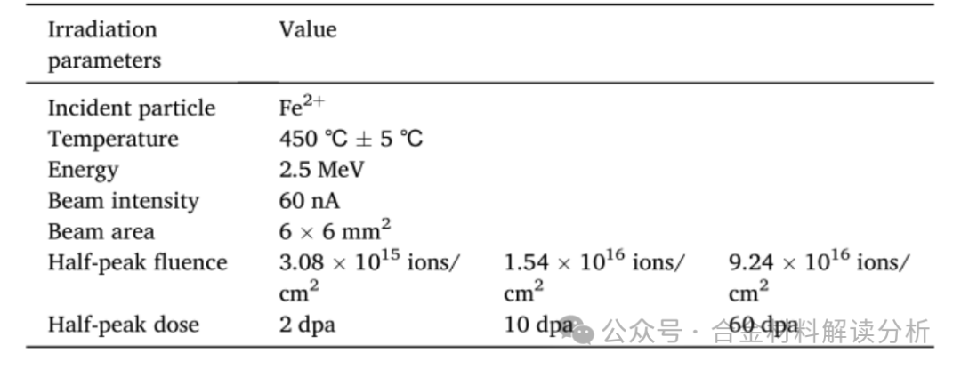 表2:321不锈钢的辐照参数。