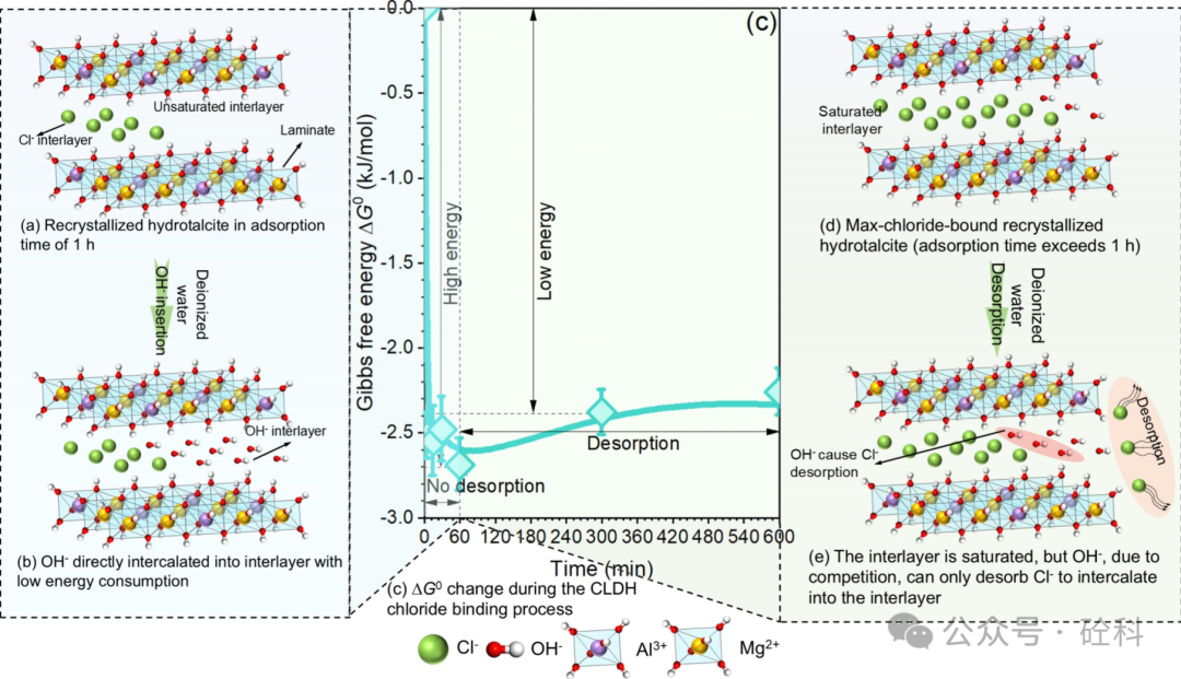 CLDH对氯离子的吸附在1小时内迅速达到平衡。此时,氯离子通过化学键进入层间,也通过物理作用吸附在带正电的层板表面。然而,平衡并非终点。研究发现,在吸附1小时后,层间化学结合的氯离子会发生显著的脱附,脱附率最高可达60%!这是由于溶液中羟基离子的竞争导致的离子交换。