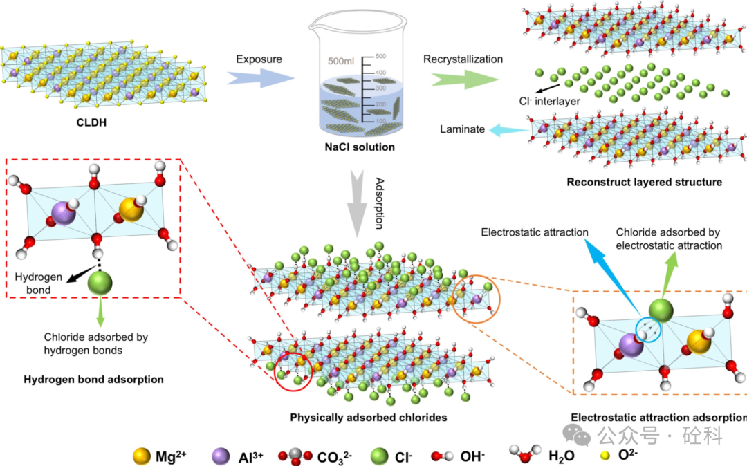论文:Physical adsorption and chemical binding of chloride in the laminate and interlayer of recrystallized hydrotalcite钢筋锈蚀是导致混凝土结构耐久性失效的“头号杀手”,而氯离子是诱发锈蚀最主要的侵蚀介质。在混凝土中添加能高效结合氯离子的材料,是延长结构寿命的关键策略。层状双氢氧化物因其独特的层状结构与阴离子交换能力,被视为极具潜力的“氯离子捕捉剂”。然而,一个根本性问题长期存在:水滑石捕获的氯离子,究竟是通过化学键牢牢锁在层间,还是仅通过物理吸附松散地挂在表面?前者稳定可靠,后者则可能在环境变化时重新释放,成为潜在的“定时炸弹”。湖南大学史才军院士团队一项发表于《Cement and Concrete Research》的研究,通过精密的对比与分离实验,首次成功定量区分并动态追踪了水滑石中物理吸附与化学结合氯离子的行为。研究揭示,看似简单的“氯离子结合”背后,隐藏着复杂而动态的竞争与转化机制。