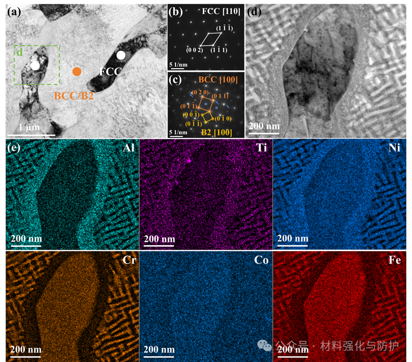 Ti加入后,合金整体依然维持FCC+BCC双相共晶特征,但BCC相内部却发生了更深层次的结构重构:在Ti促进下,BCC基体发生调幅分解,并伴随有序化转变,逐步形成Cr-Fe富集区与Ni-Al-Ti富集有序B2区交替分布的纳米化学有序异质结构。这意味着,Ti在不破坏原有共晶结构框架的前提下,实现了更精细的纳米尺度组织调控。