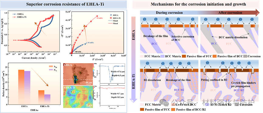 研究提出,Ti诱导化学异质性对耐蚀性的贡献具有“双重作用”:其一是“钝化调控效应”,即通过Al-Ti富集的B2相优先选择性溶解释放Al3+/Ti4+,优先成核形成Al2O3/TiO2,并促进Cr2O3的异质形核与持续生长,推动形成更致密、更稳定的复合钝化膜。其二是“空间阻断效应”,即钝化膜击穿后,优先腐蚀B2相可在表面形成热力学稳定的Al2O3/TiO2保护层减缓腐蚀,并通过分散Cr富集微区限制点蚀扩展。正是这两种效应的协同,使材料获得了更优异的耐蚀表现。