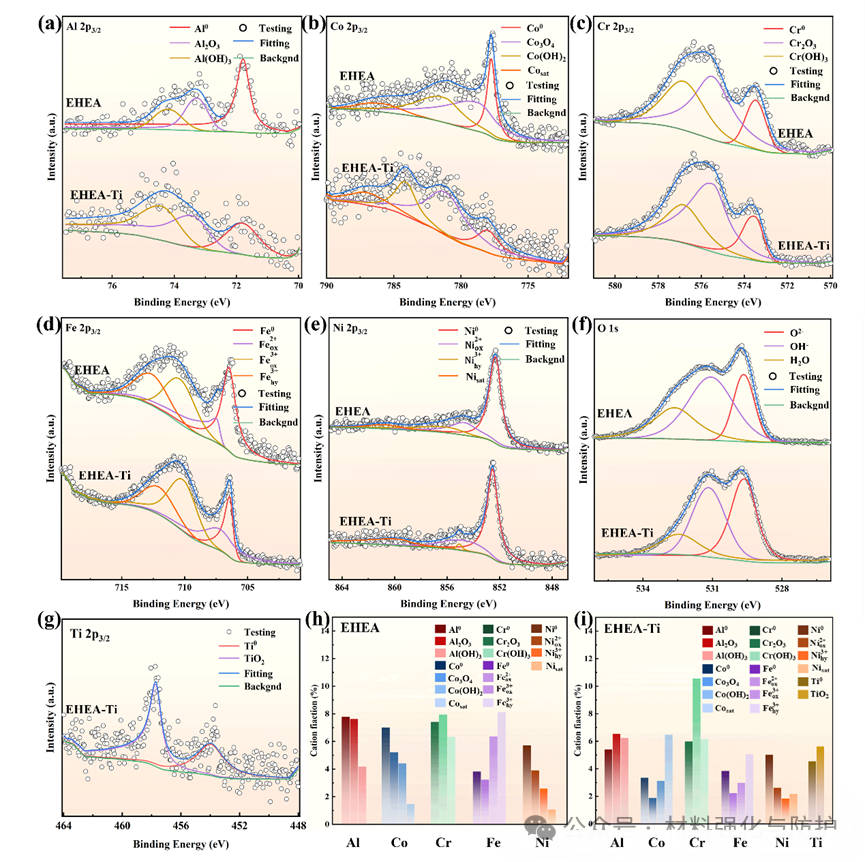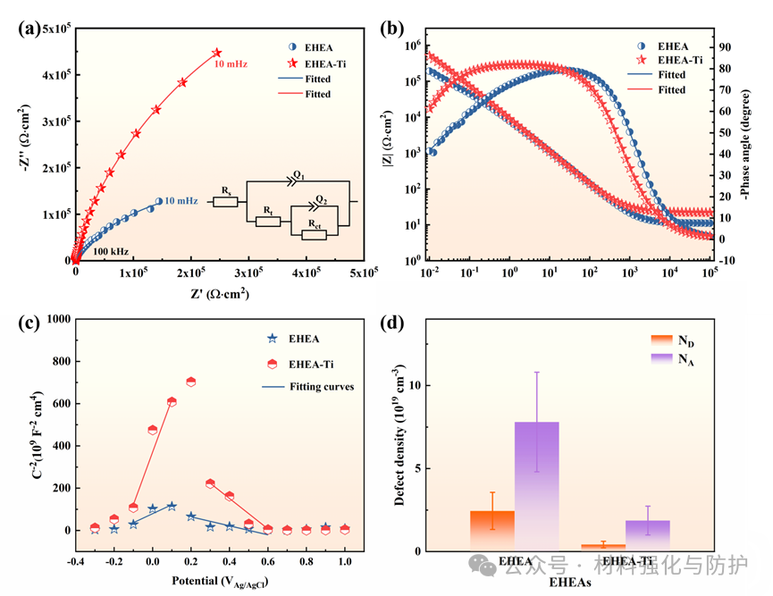 EIS结果表明,含Ti样品电荷转移电阻明显提升;通过全频电化学阻抗谱测量和等效电路拟合构建Mott-Schottky结果显示,含Ti样品钝化膜中的载流子浓度降低,意味着膜层缺陷密度更低、Cl-更难穿透。钝化膜XPS和TEM进一步证实,Ti改性后钝化膜中Cr2O3含量提高,并形成了Cr2O3主导、TiO2与Al2O3协同增强的复合氧化膜;同时,合金表面形成了连续均匀的纳米级非晶钝化层,在FCC相和BCC/B2相表面均能稳定覆盖。
