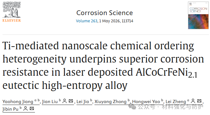 围绕这一难题,中科院宁波材料所蒲吉斌研究员与北京科技大学郑磊教授团队提出了一种新思路:不再单纯追求“成分均匀化”,而是通过受控量Ti微合金化和激光沉积非平衡凝固定向设计,构建纳米尺度化学有序异质结构,以调控耐蚀Cr元素的空间分布和钝化膜钝化行为,从微观机制上提升材料耐蚀性。该研究工作成功解决了传统共晶高熵合金中“局部腐蚀易发生、钝化膜不稳定”的核心问题,为海洋环境用耐蚀共晶高熵合金的成分-结构协同设计提供了新的理论依据。相关研究成果以题为“Ti-mediated nanoscale chemical ordering heterogeneity underpins superior corrosion resistance in laser deposited AlCoCrFeNi2.1 eutectic high-entropy alloy”发表在了腐蚀领域国际期刊《Corrosion Science》上。