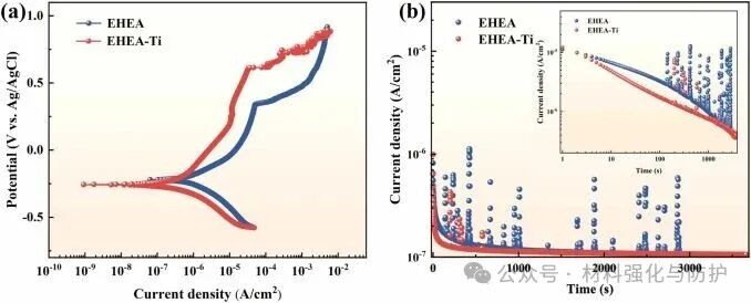 Ti改性样品的自腐蚀电流密度明显降低,表明整体腐蚀动力学被显著减缓;其点蚀电位几乎翻倍,钝化区间明显拓宽,说明材料抵抗局部膜破裂和点蚀萌生的能力大幅增强。同时,恒电位极化过程中电流波动显著减少,表明亚稳态点蚀受到有效抑制。