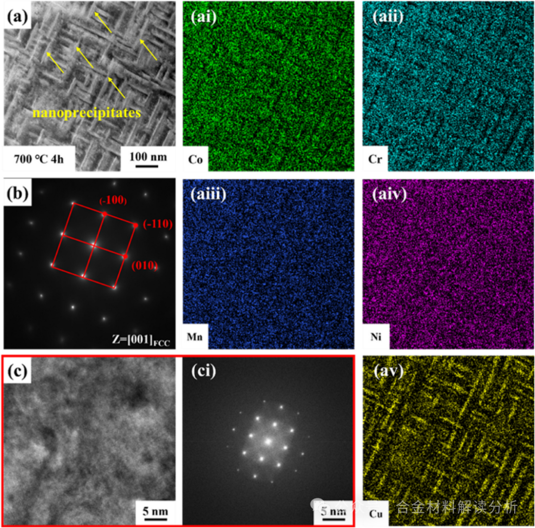 图8:Co29Cr31Cu4Mn15Ni21高熵合金在700 °C时效4 h的透射电镜表征:(a)扫描透射明场图像及相应的元素分布图,显示高密度富Cu纳米颗粒的均匀分布;(b)从图8a所示整个区域获得的选区电子衍射花样;(c)高分辨透射电镜图像及相应的快速傅里叶变换分析,表明纳米析出相与基体共格。