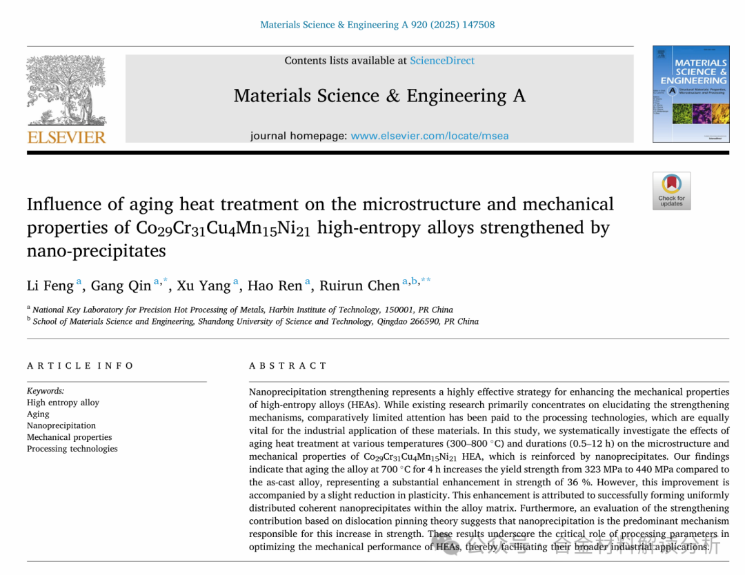 纳米析出相强化是提升高熵合金力学性能的一种高效策略。现有研究主要集中于阐明强化机制,而对加工工艺的关注相对有限,然而加工工艺对于这些材料的工业应用同样至关重要。本研究系统考察了不同温度(300–800 °C)和时长(0.5–12 h)的时效热处理对纳米析出相强化Co29Cr31Cu4Mn15Ni21高熵合金微观结构和力学性能的影响。研究结果表明,与铸态合金相比,在700 °C时效4 h使合金的屈服强度从323 MPa提升至440 MPa,强度显著提高了36%,但这一改善伴随着塑性的轻微降低。这种强化归因于在合金基体中成功形成了均匀分布的共格纳米析出相。此外,基于位错钉扎理论对强化贡献的评估表明,纳米析出相强化是导致强度增加的主要机制。这些结果强调了工艺参数在优化高熵合金力学性能中的关键作用,从而促进其更广泛的工业应用。