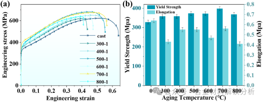 图3:Co29Cr31Cu4Mn15Ni21高熵合金在铸态和时效态(300–800 °C时效1 h)下的力学性能:(a)拉伸工程应力-应变曲线;(b)屈服强度和延伸率。